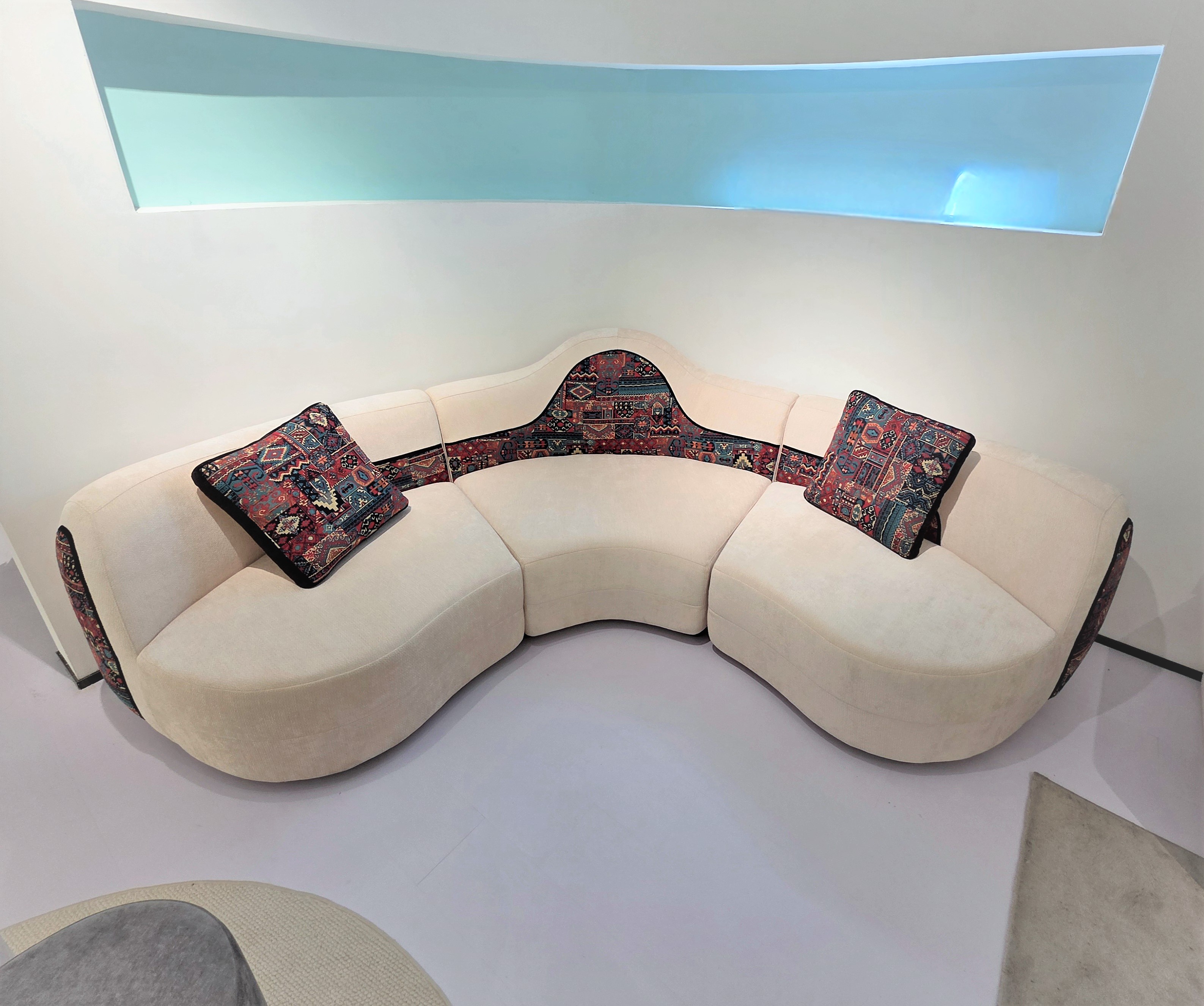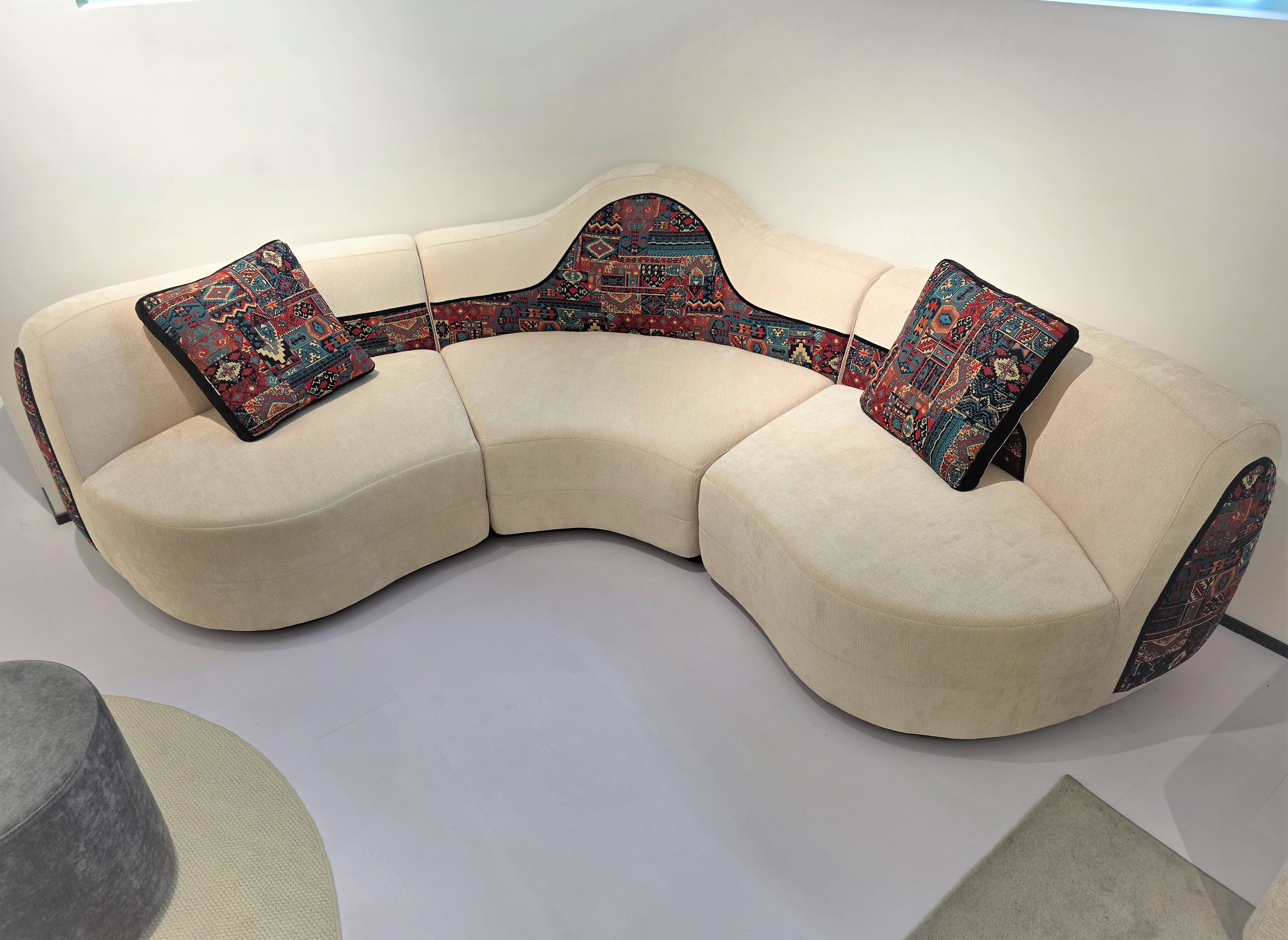 Диван в мягкой комбинированной ткани состоит из трех модулей.