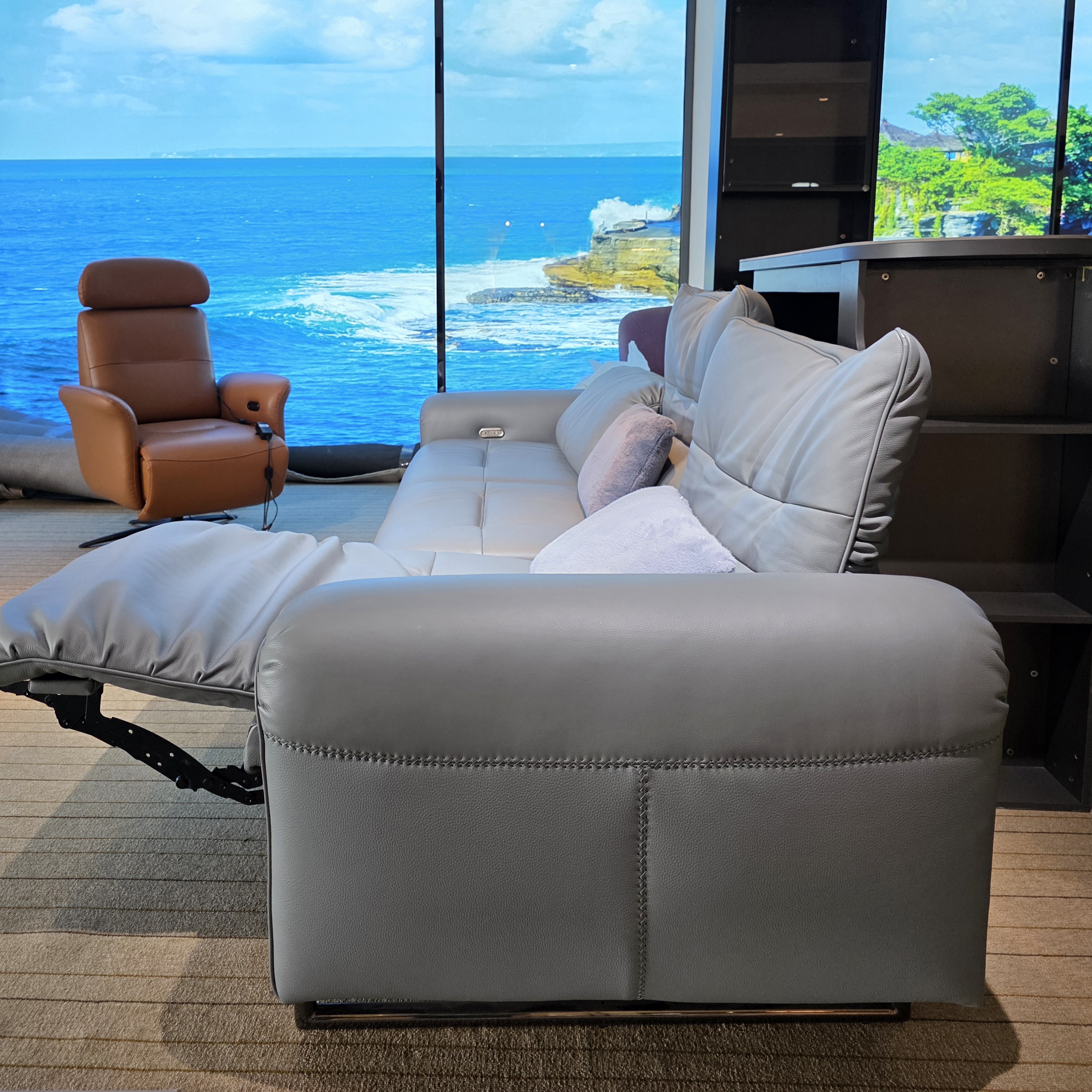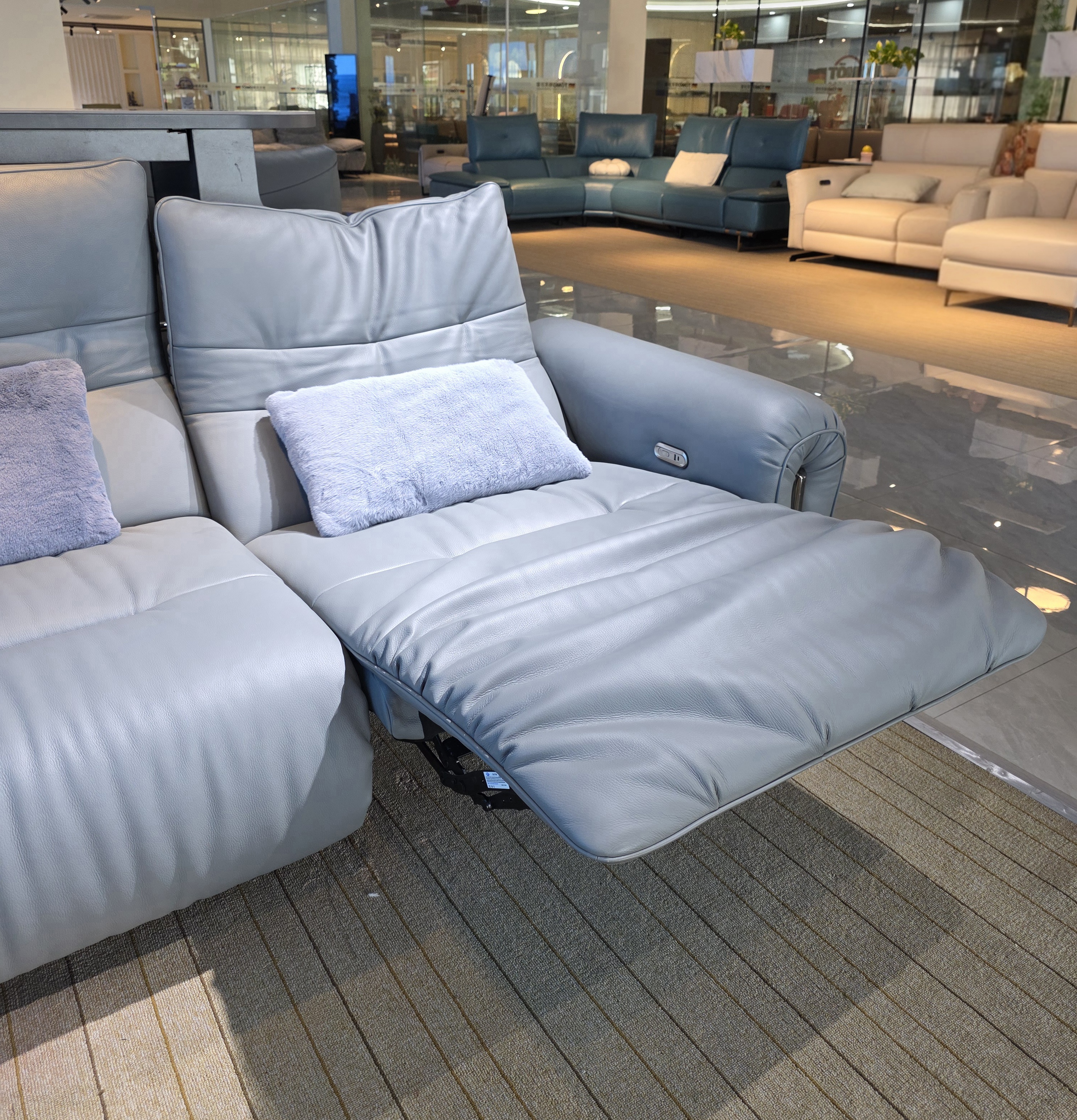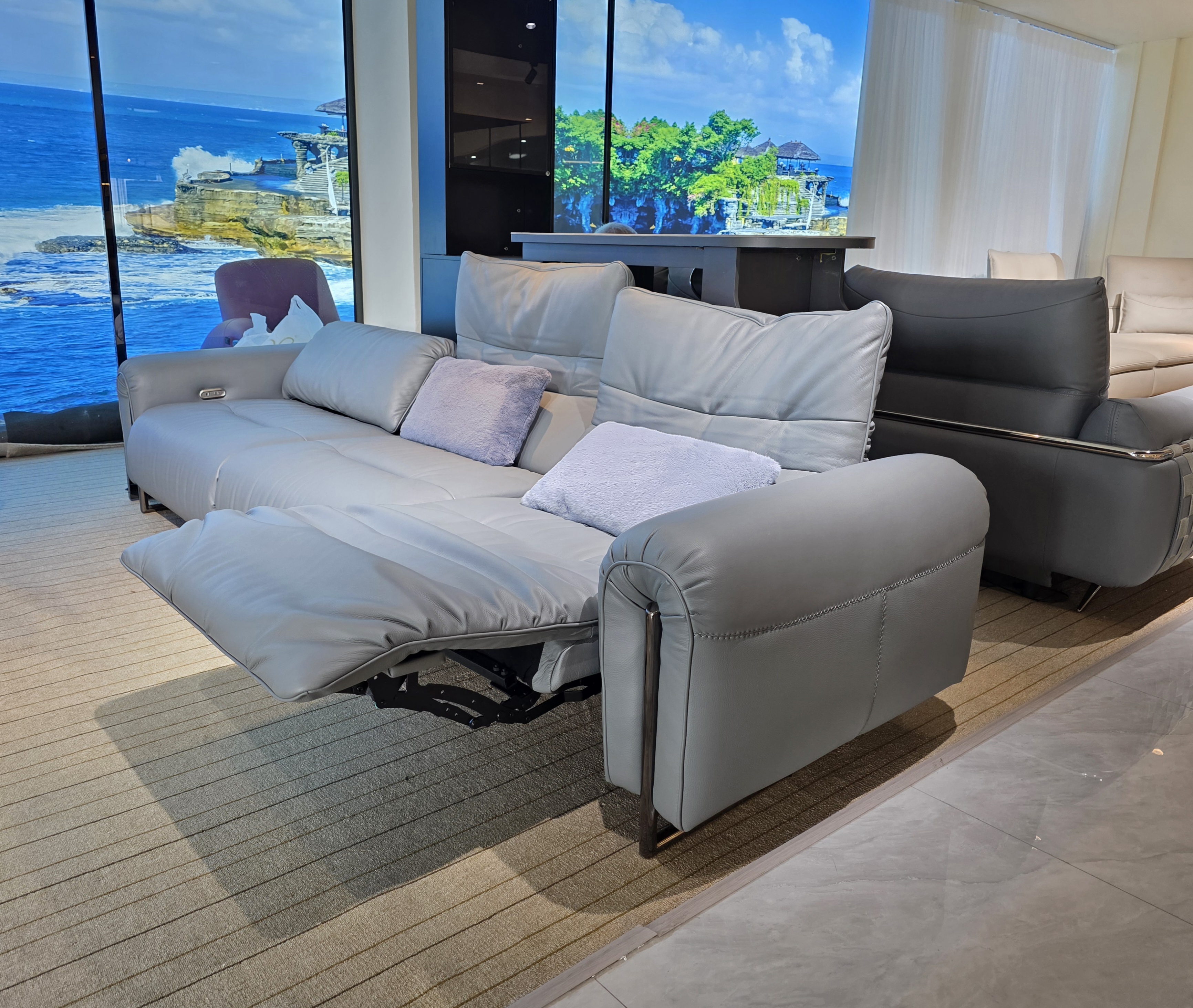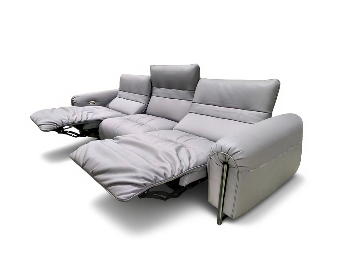 Диван-реклайнер оснащен двумя раздвижными электро-механизмами и регулируемыми подголовниками, позволяющими подобрать наиболее удобное положение.