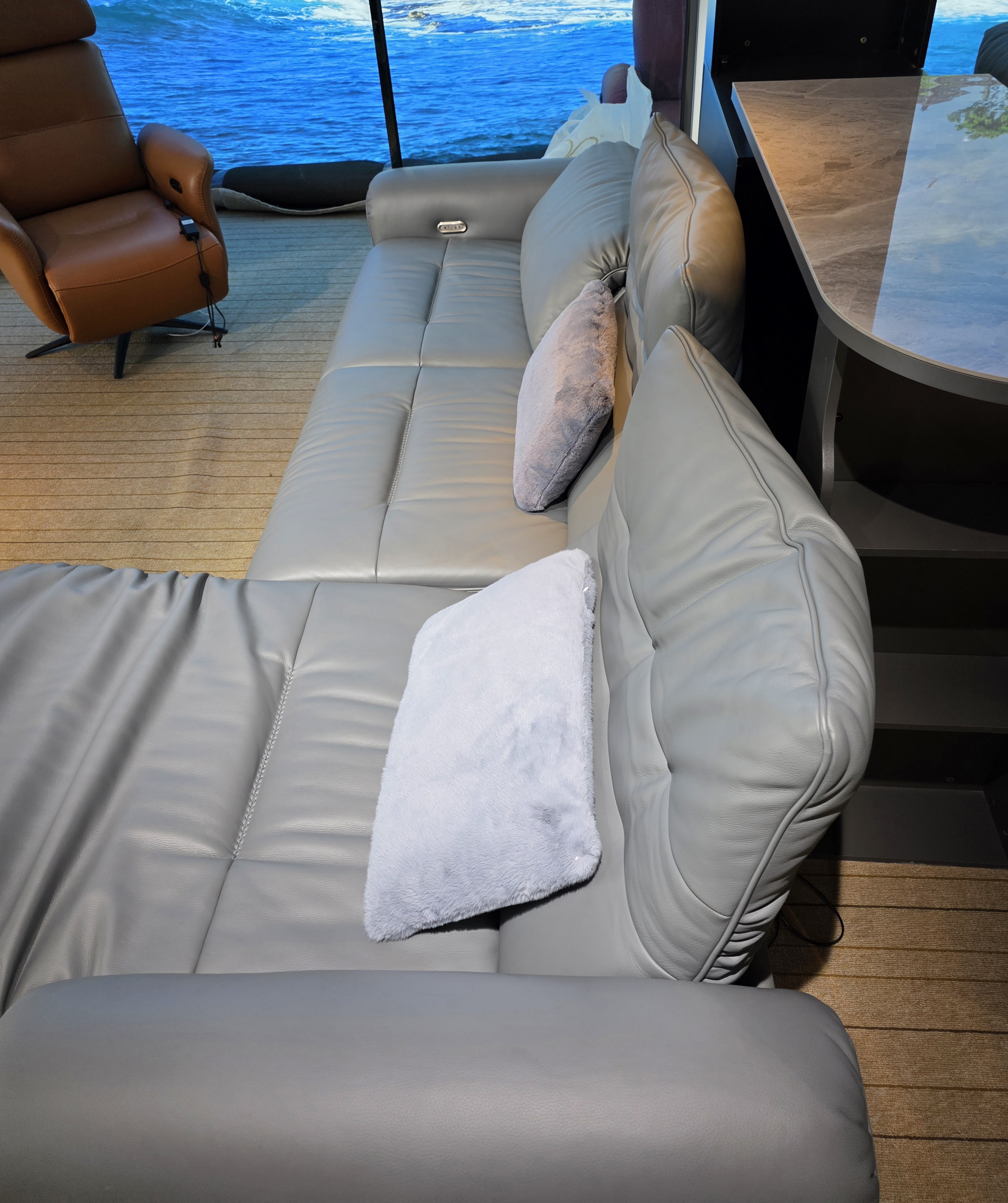 Реклайнер позволяет менять наклон спинки и поднимать подножку до полулежащего положения. Кнопка каждого электромеханизма находится на внутренней части подлокотника, там же встроен порт USB и Type-C.