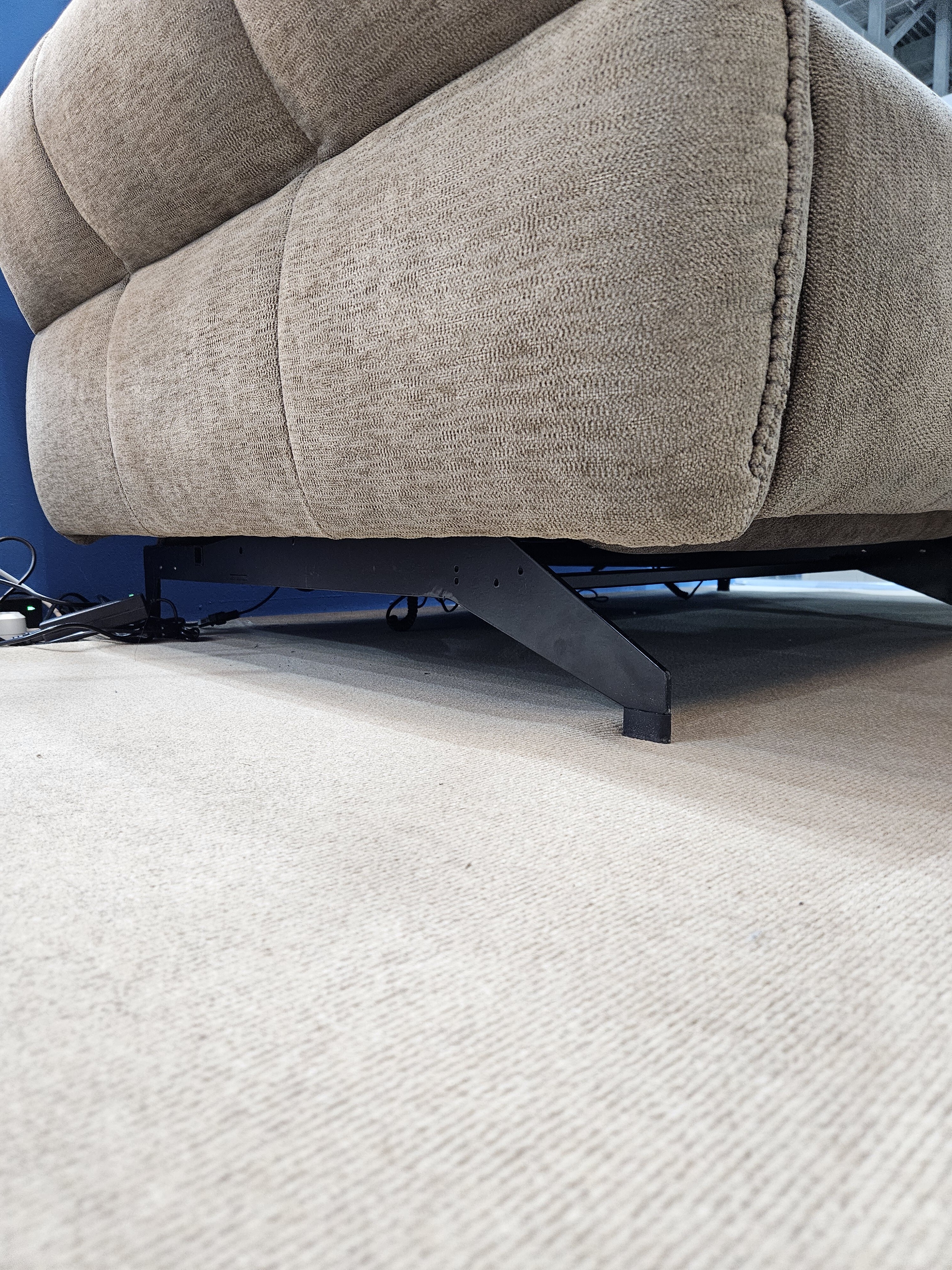 Диван позволяет менять наклон спинки и поднимать подножку до полулежащего положения. Пульт управления в комплекте.