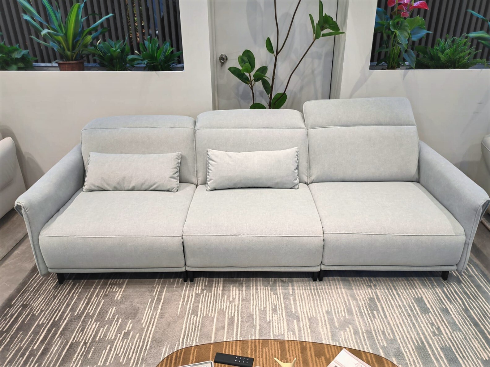 Диван позволяет менять наклон спинки и поднимать подножку до полулежащего положения. Пульт управления в комплекте.