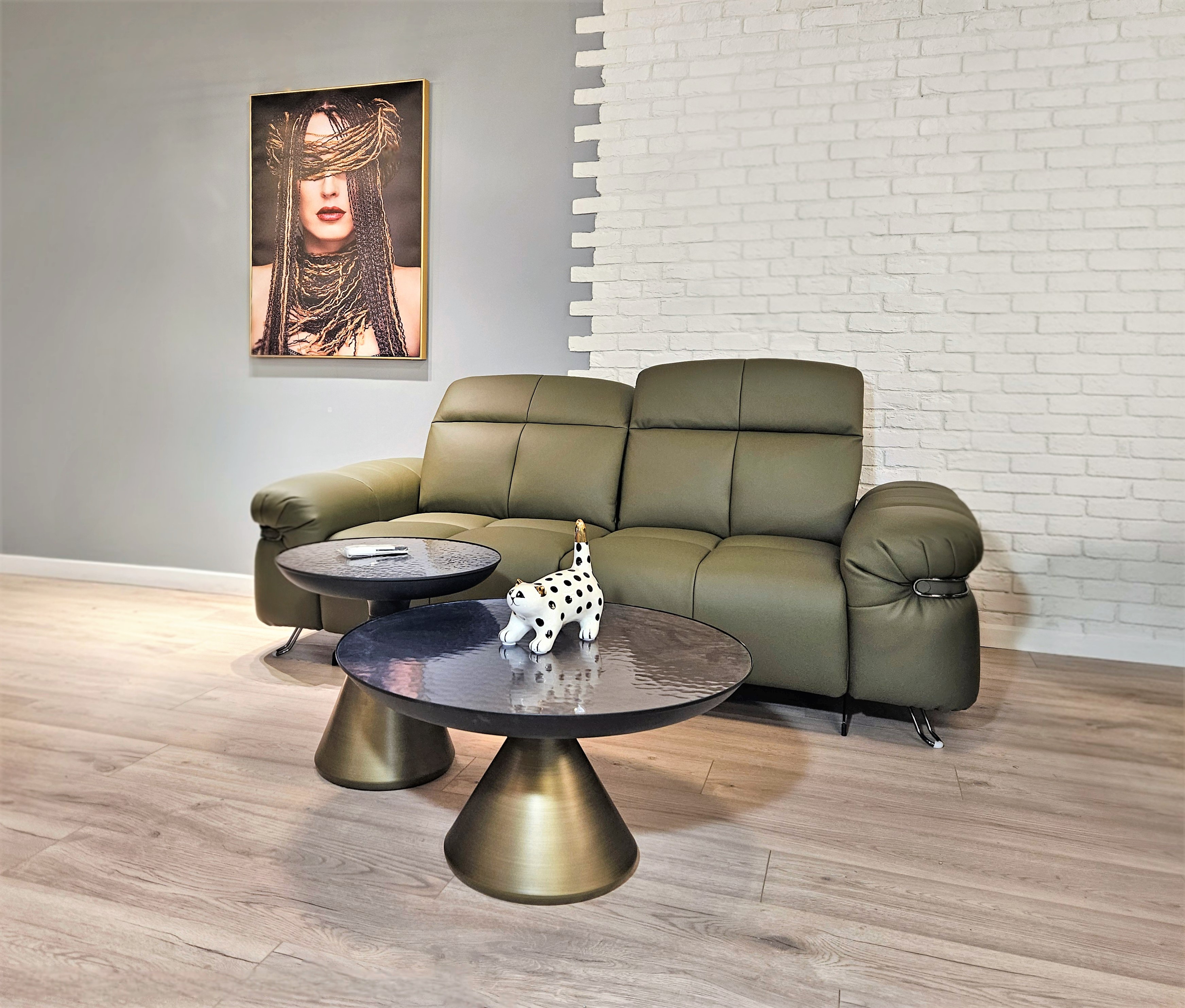 Диван позволяет менять наклон спинки и поднимать подножку до полулежащего положения. Пульт управления в комплекте.