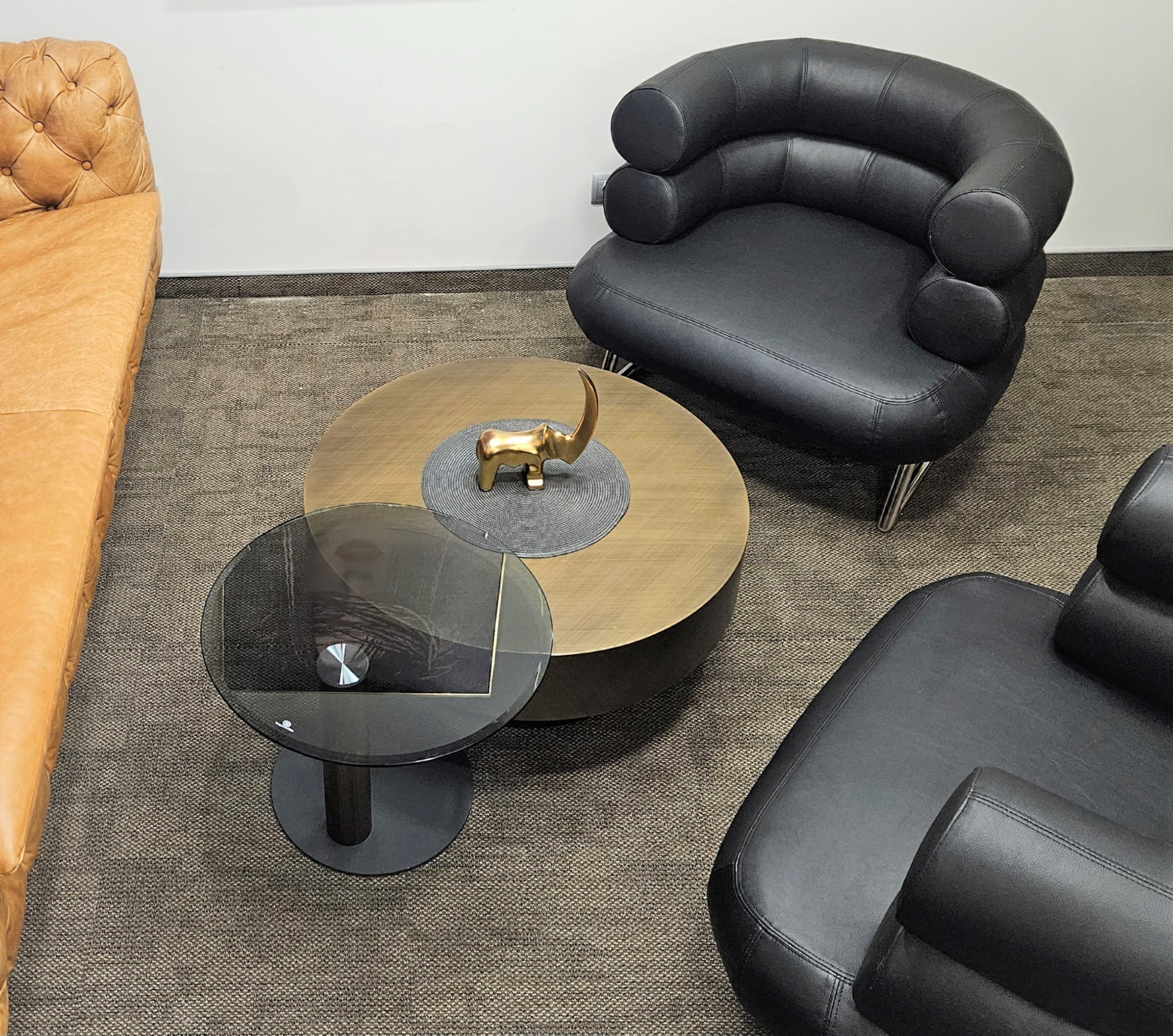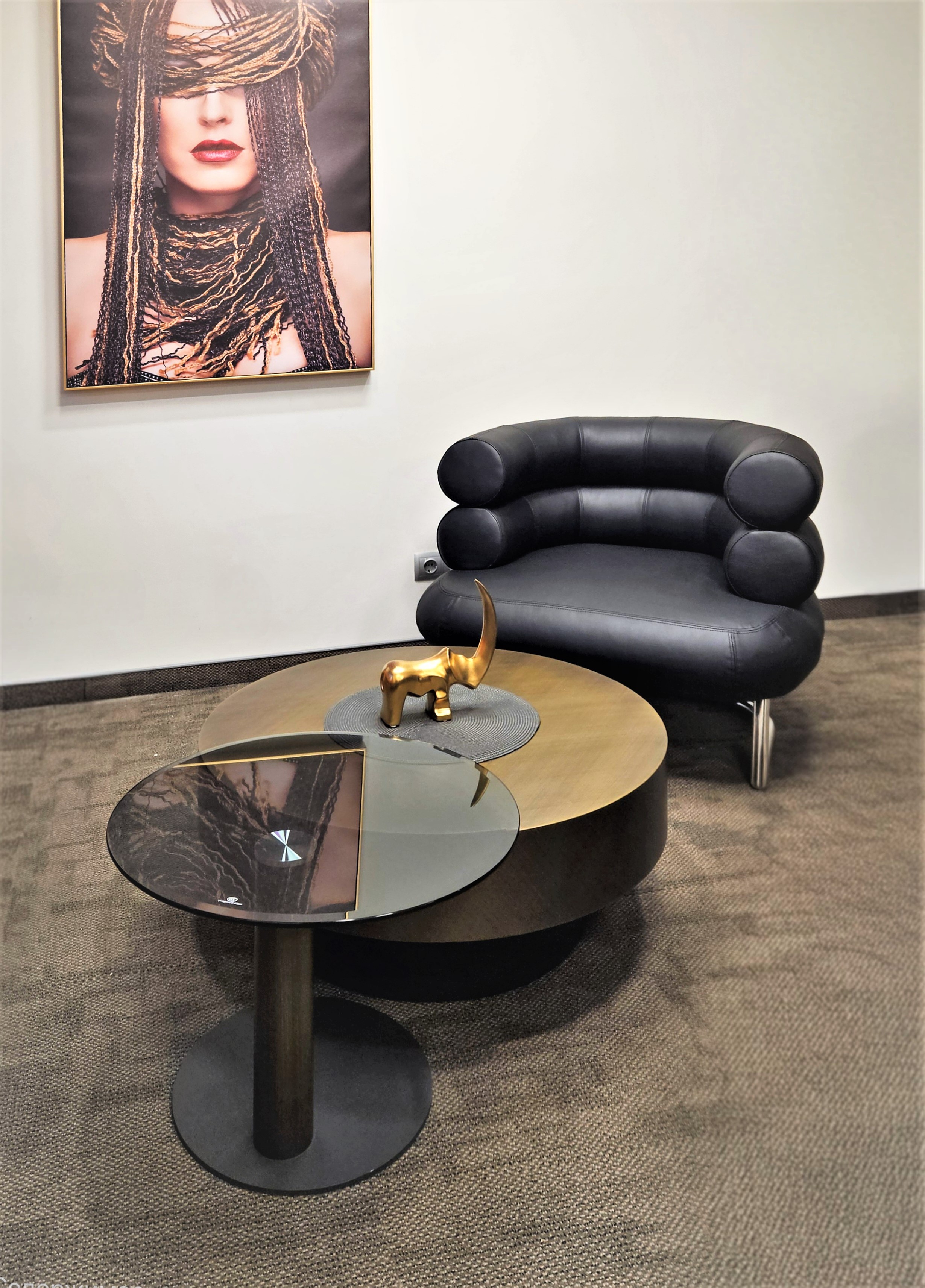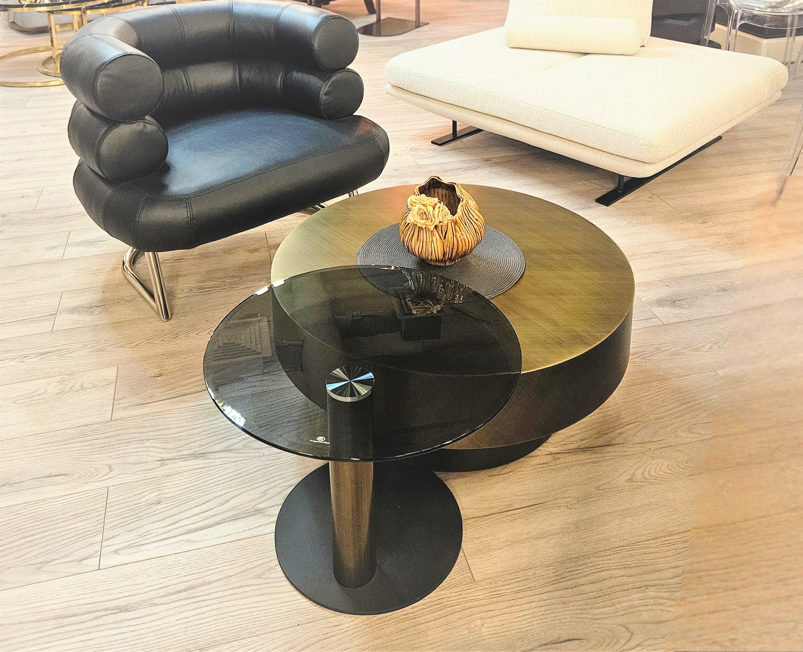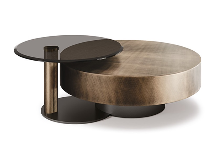 Стол выполнен из металла, цвет матовая бронза и стекла, цвет дымчатый.