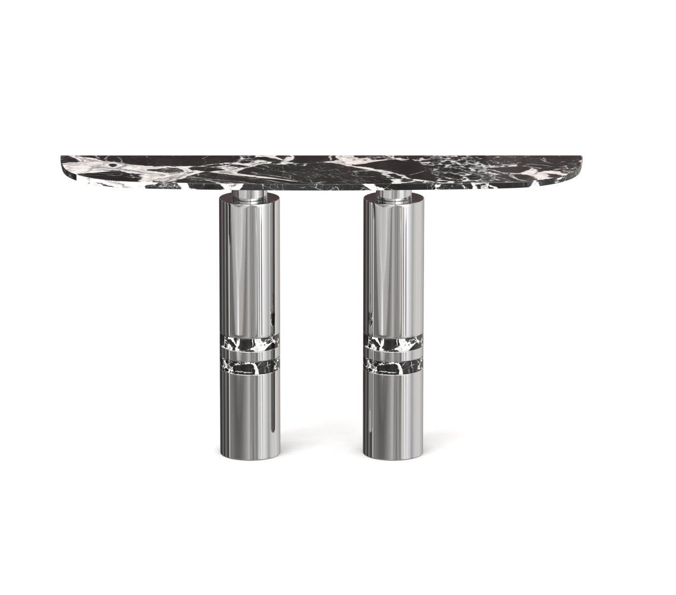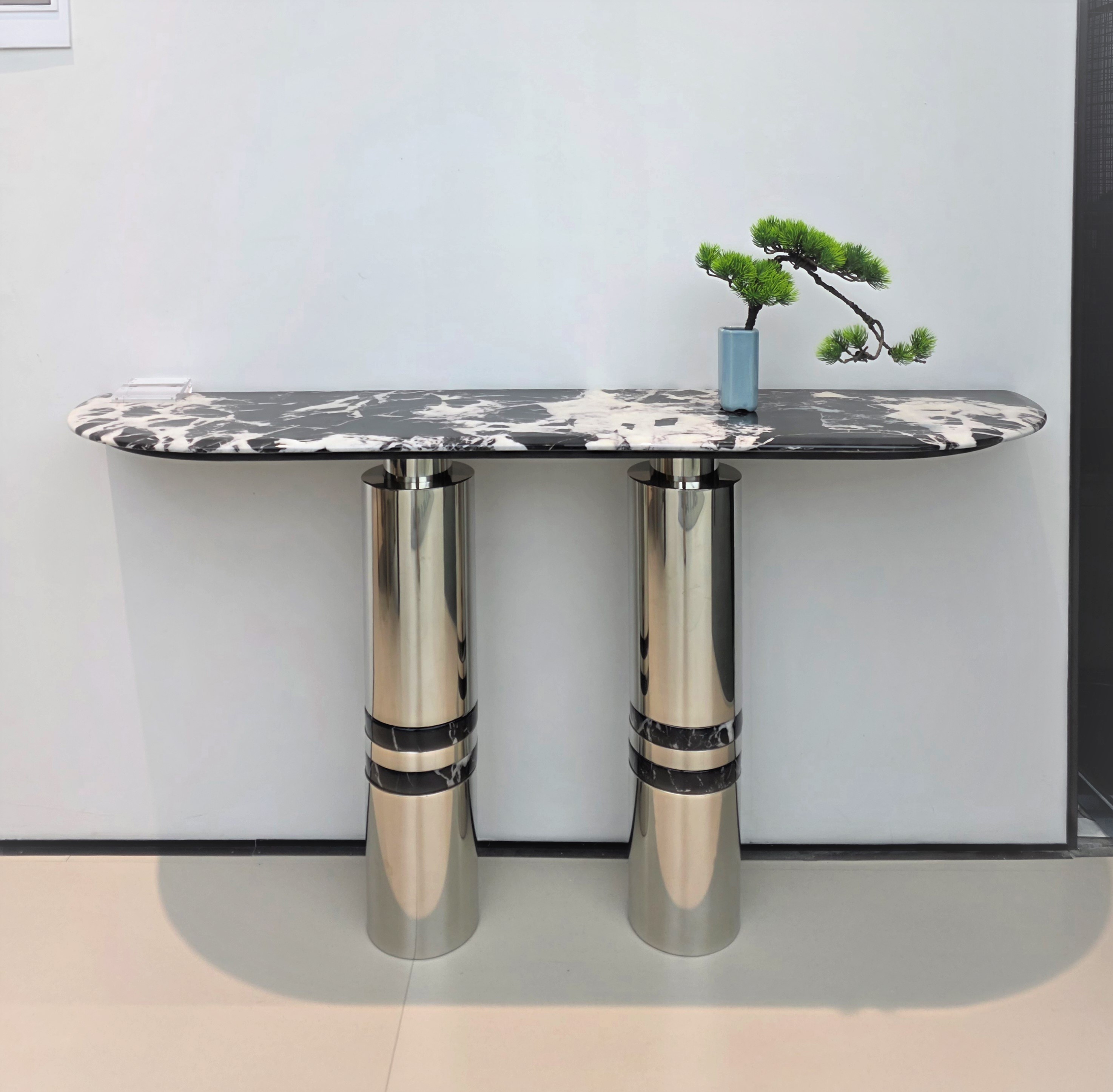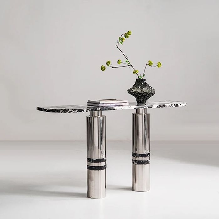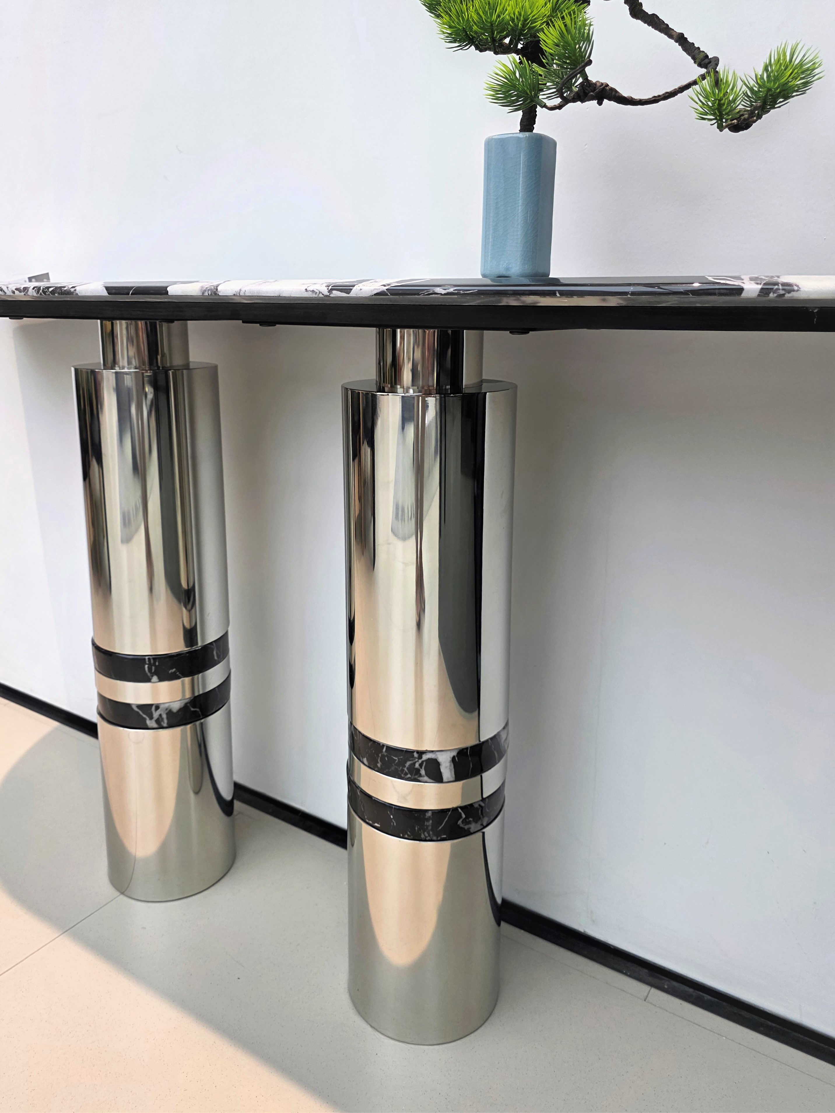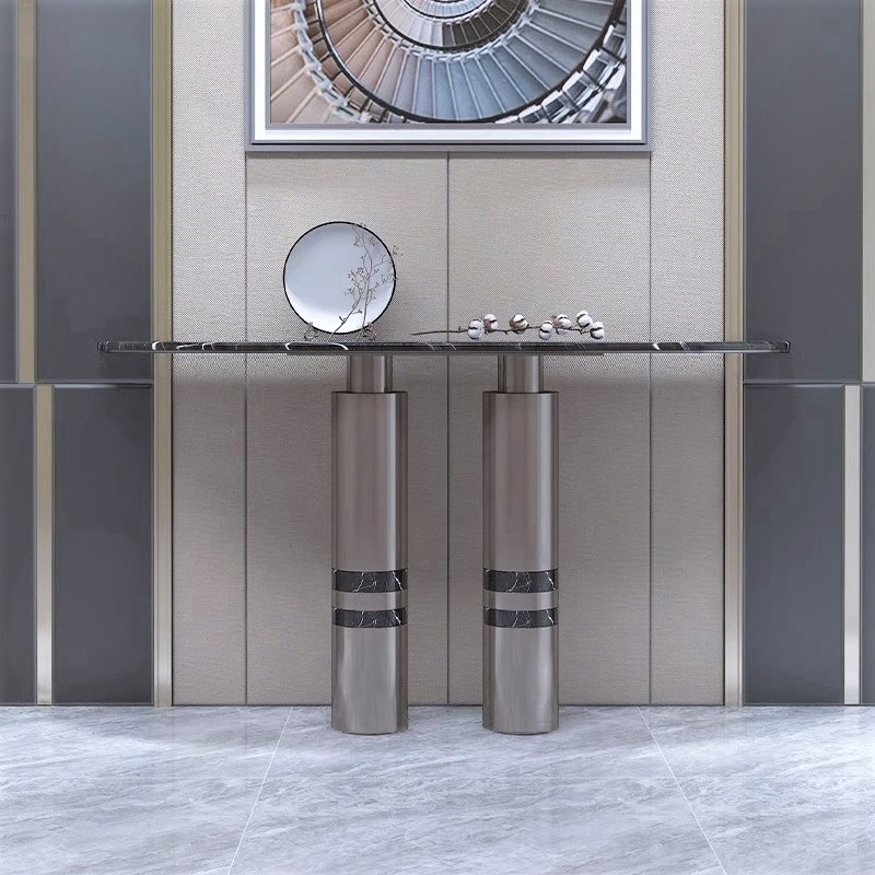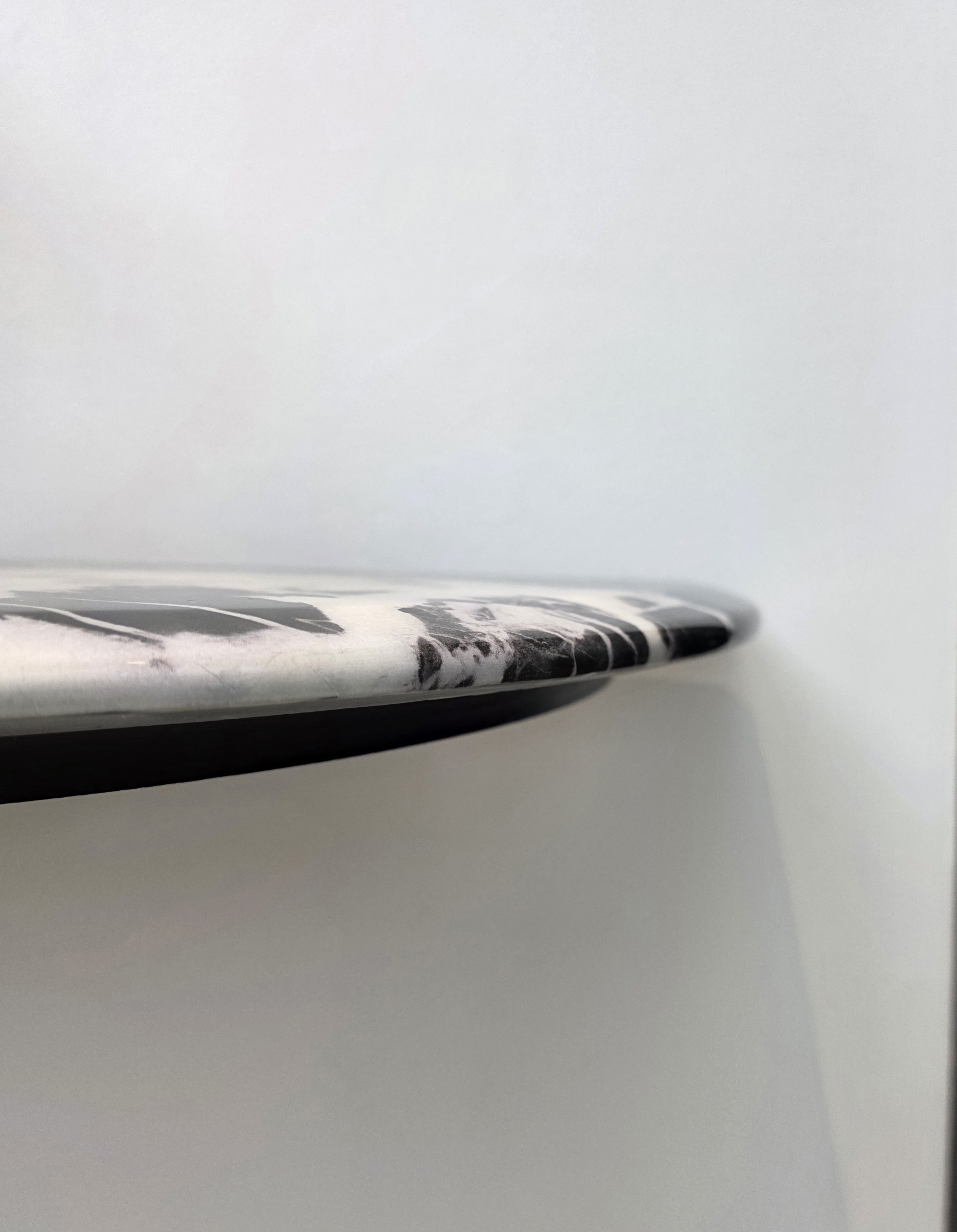 Столешница с закругленными углами выполнена из агломерата (композитного камня с мраморной крошкой). Поверхность столешницы глянцевая с полимерным покрытием под черный мрамор с белыми и серыми линиями.