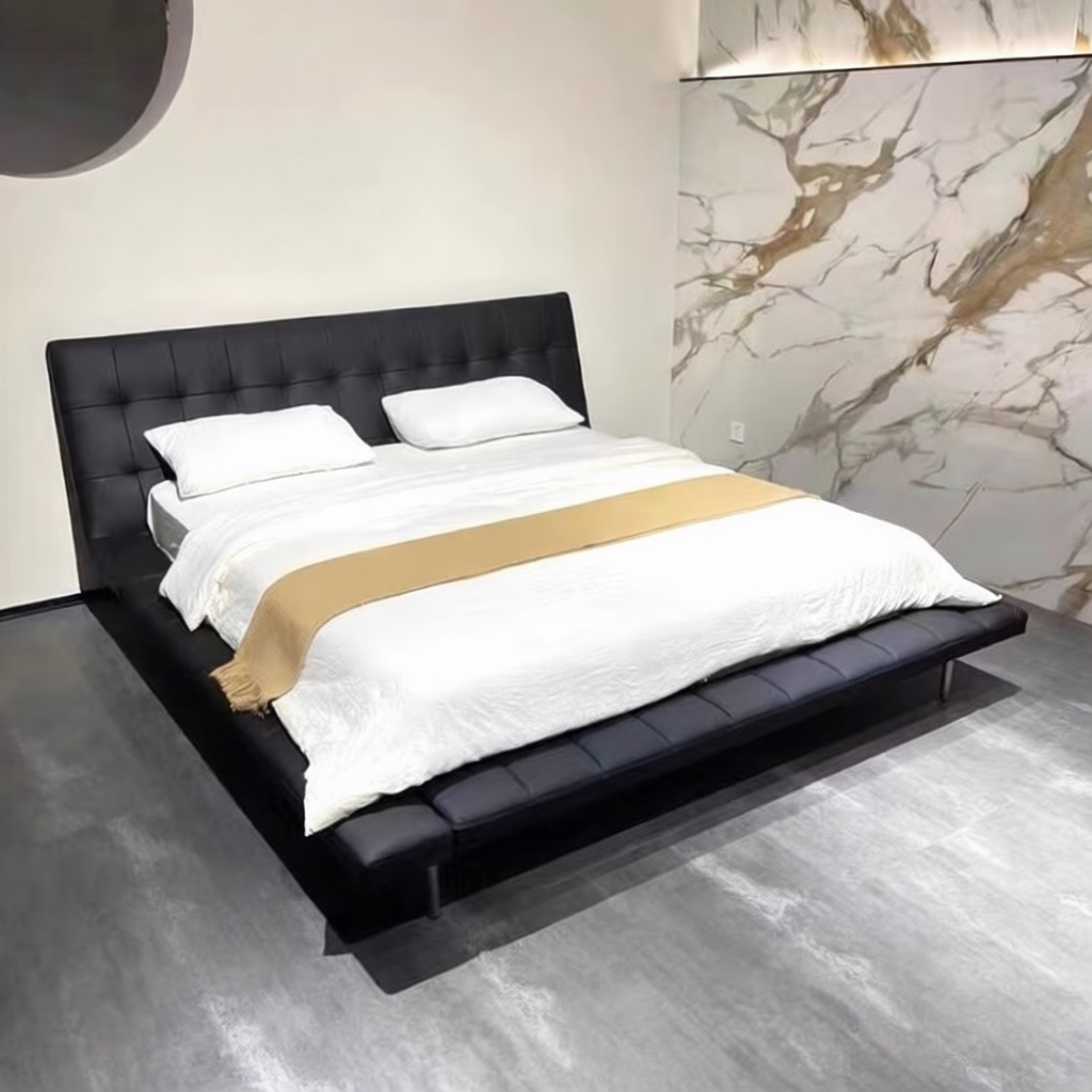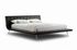 Кровать представлена в коже черного цвета.