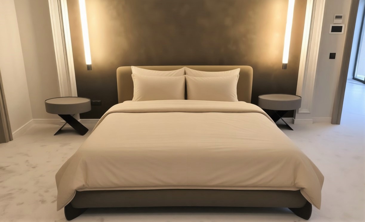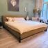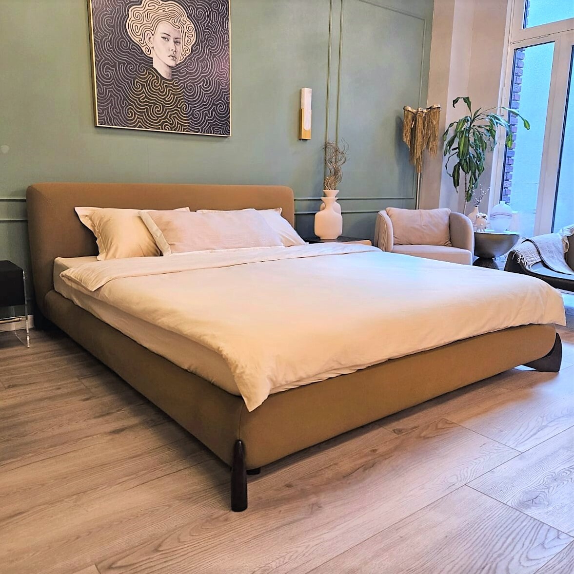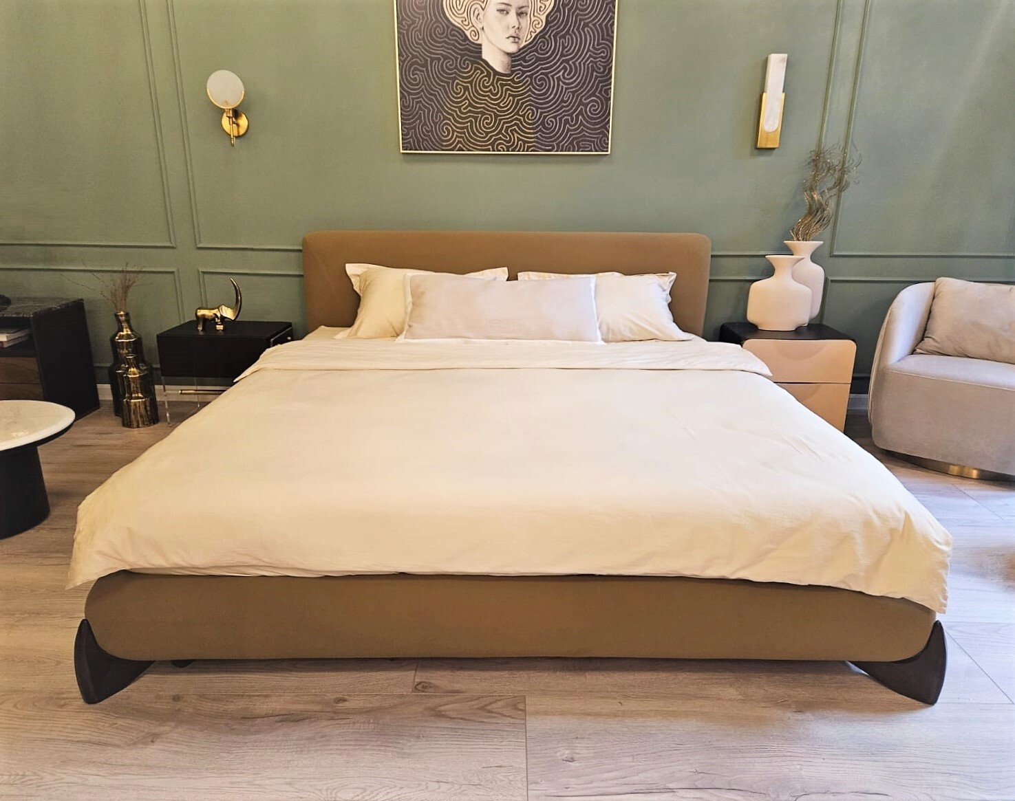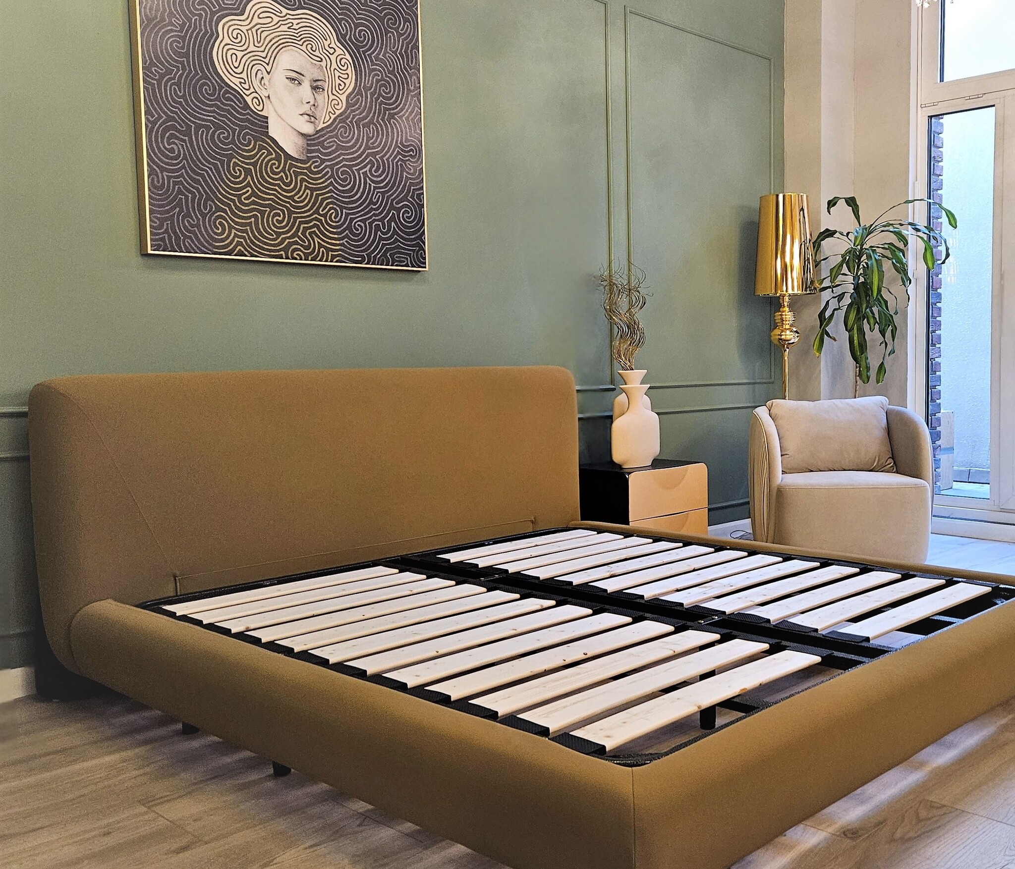 Кровать представлена в мягкой микрофибровой ткани (искусственный нубук), цвет капучино.