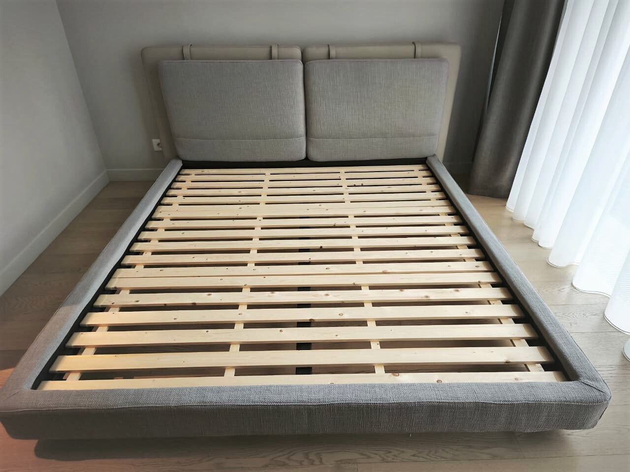 Кровать представлена в экокоже серого цвета и ткани рогожка серого-бежевого цвета.