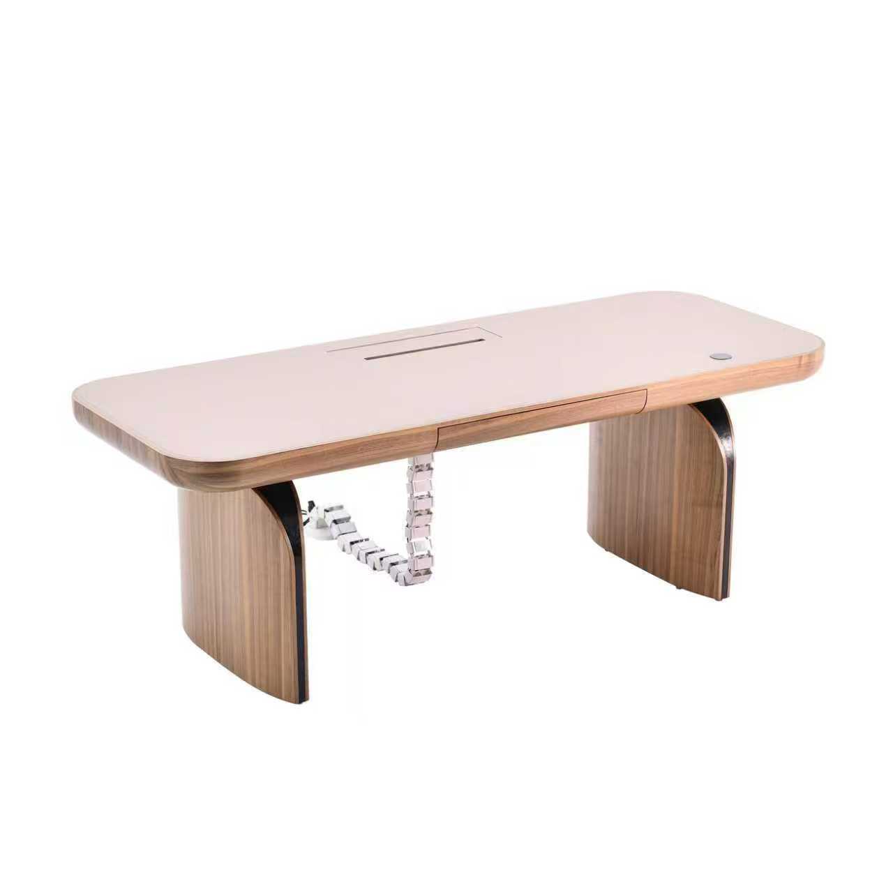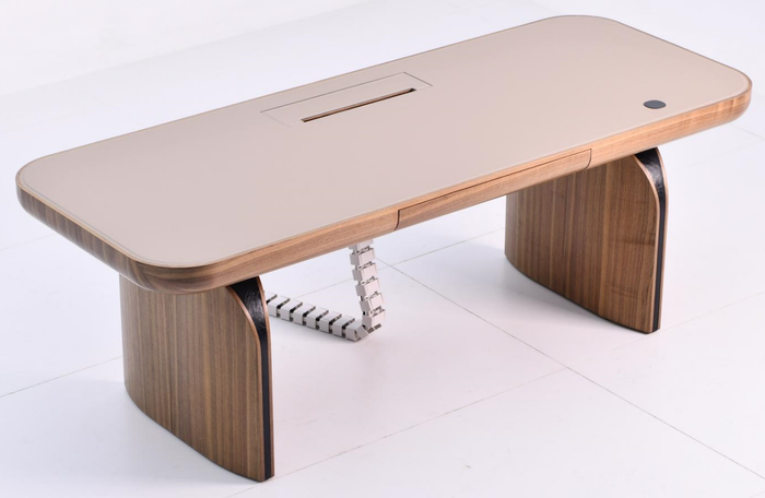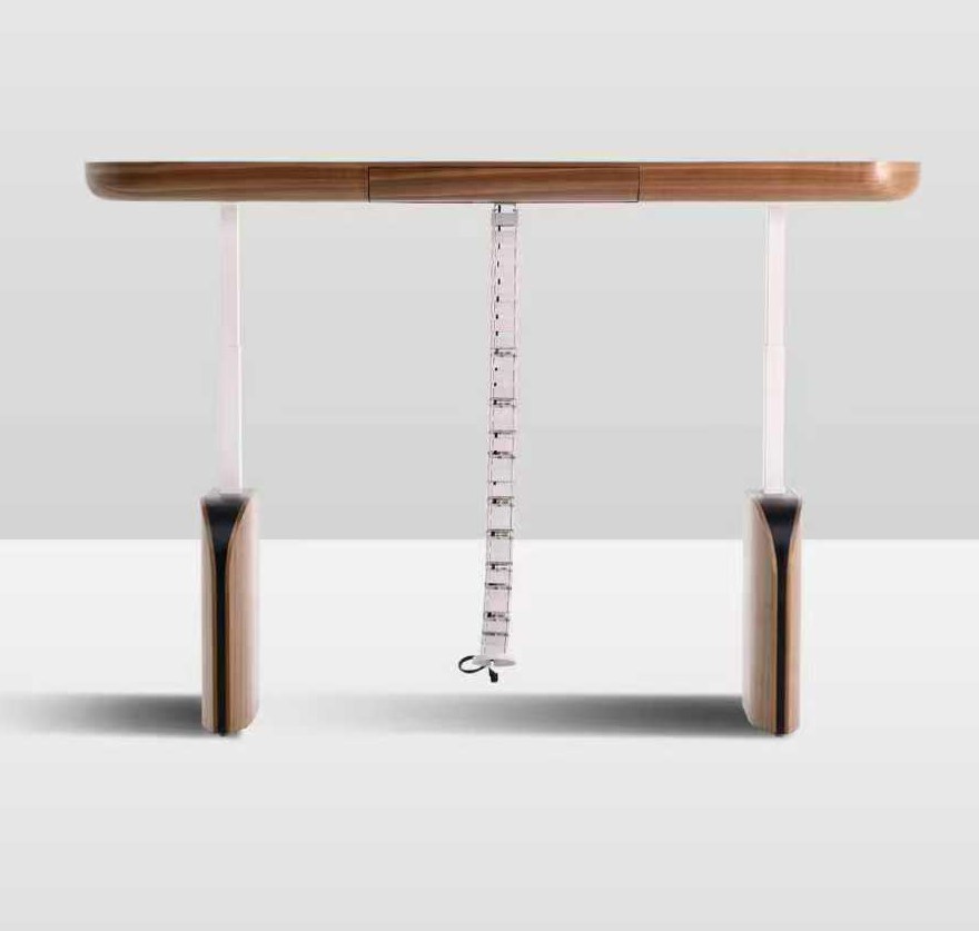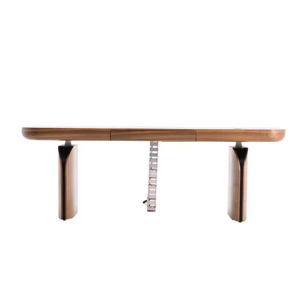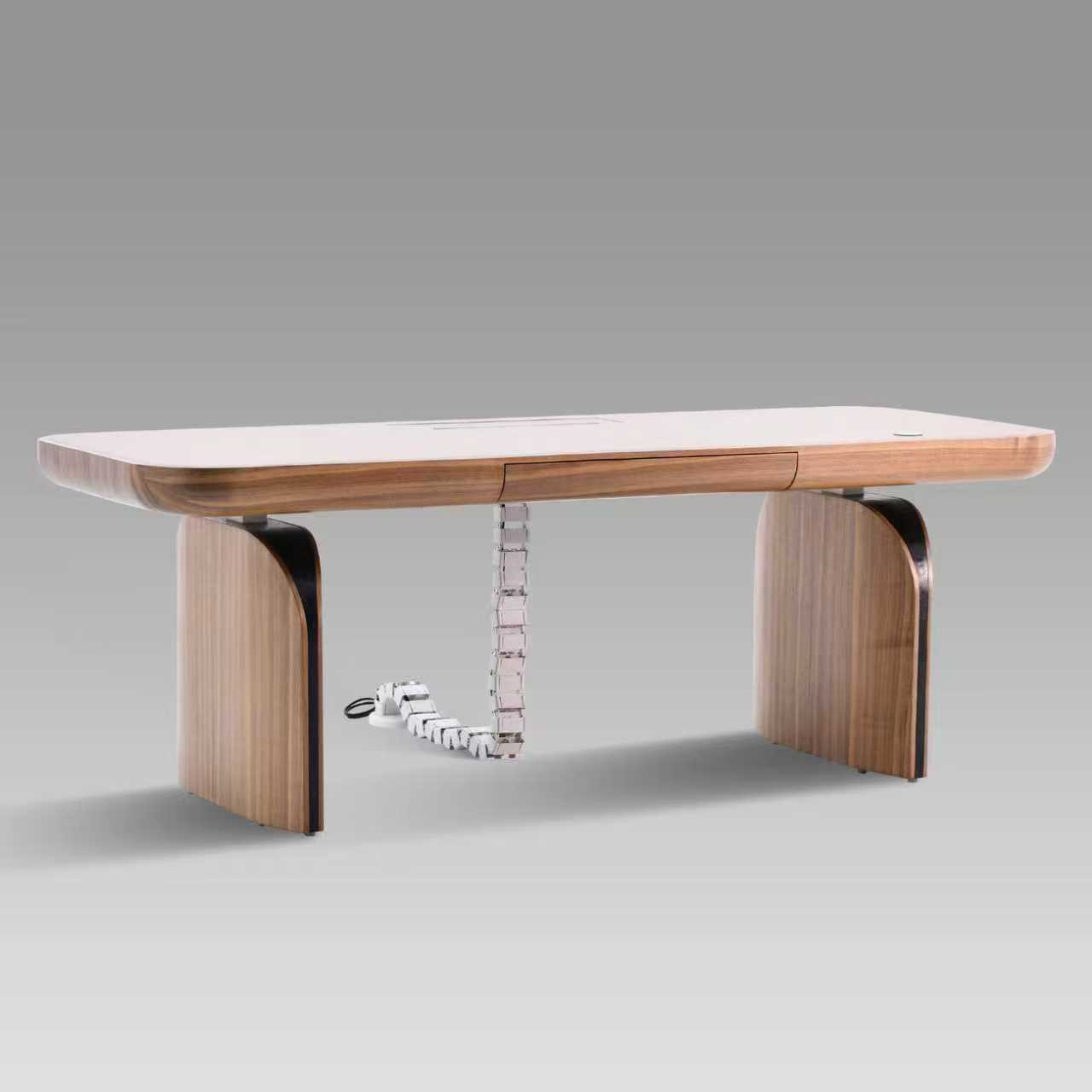 Изящное сочетание стали, дерева и микрофибровой кожи придаёт ему особую изысканность. Шпон ореха подчёркивает природную элегантность модели. Подъёмный механизм позволяет регулировать высоту (от 75 до 130 см), обеспечивая комфорт при работе и отдыхе. Большой прямоугольный формат (ширина — 180 см, глубина — 75 см) идеально впишется даже в просторные помещения.