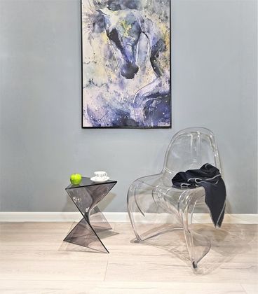 В геометрии двух вертикальных опор гармонично сочетаются фактура дерева и блеск хромированного металла.