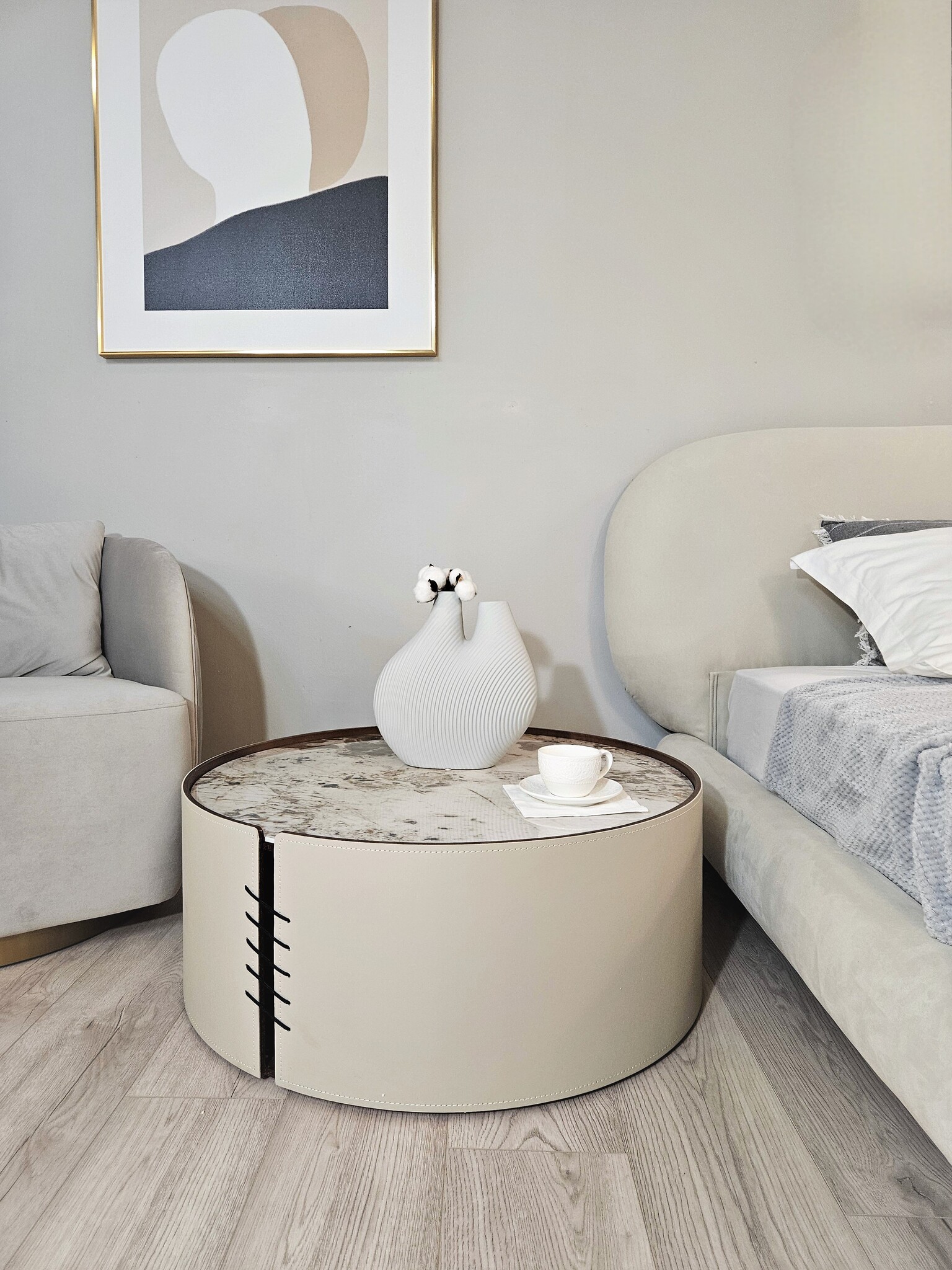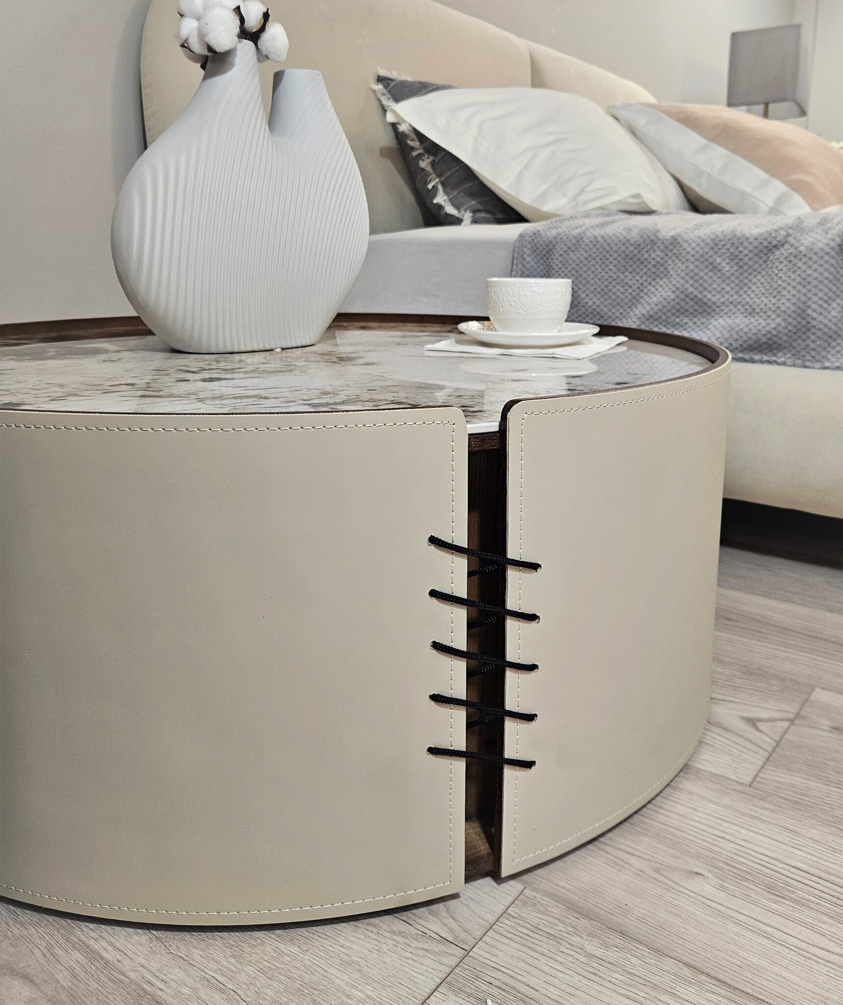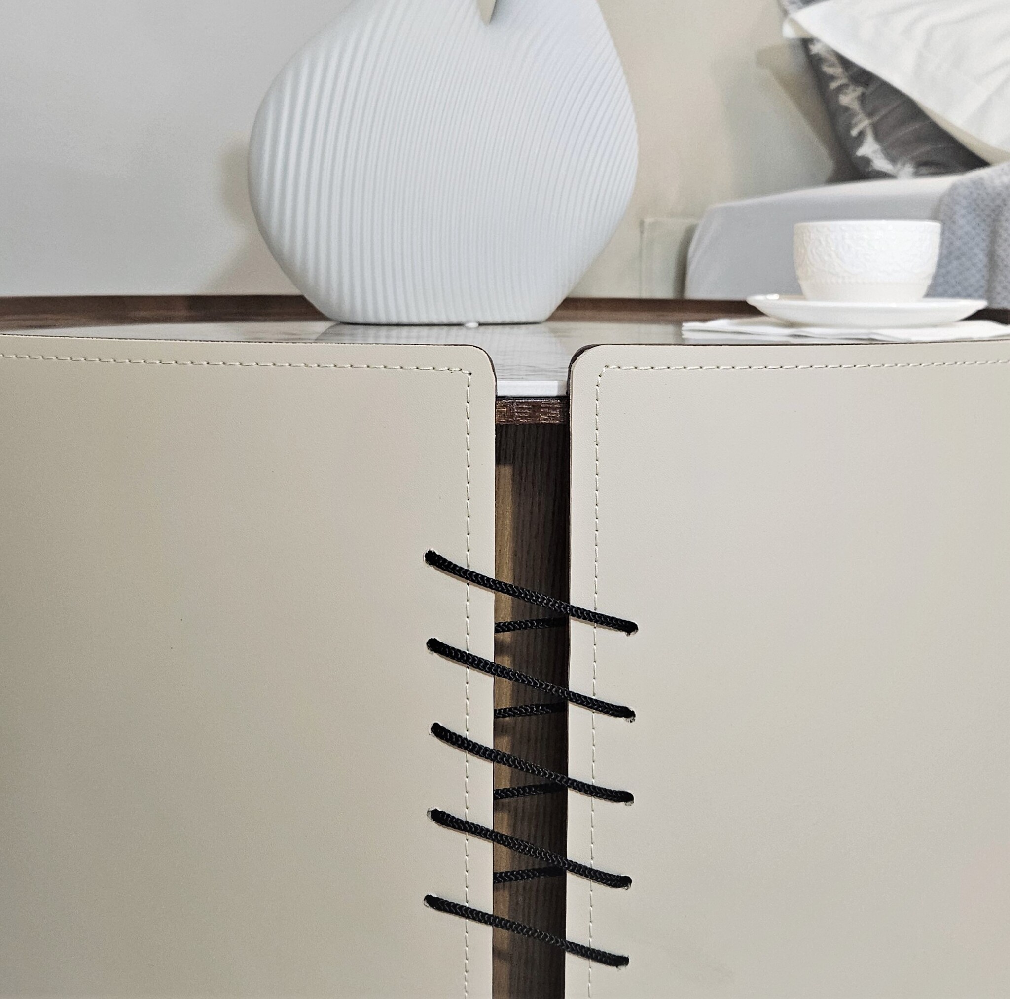 Обивка выполнена из экокожи в серо-бежевой цветовой гамме.