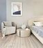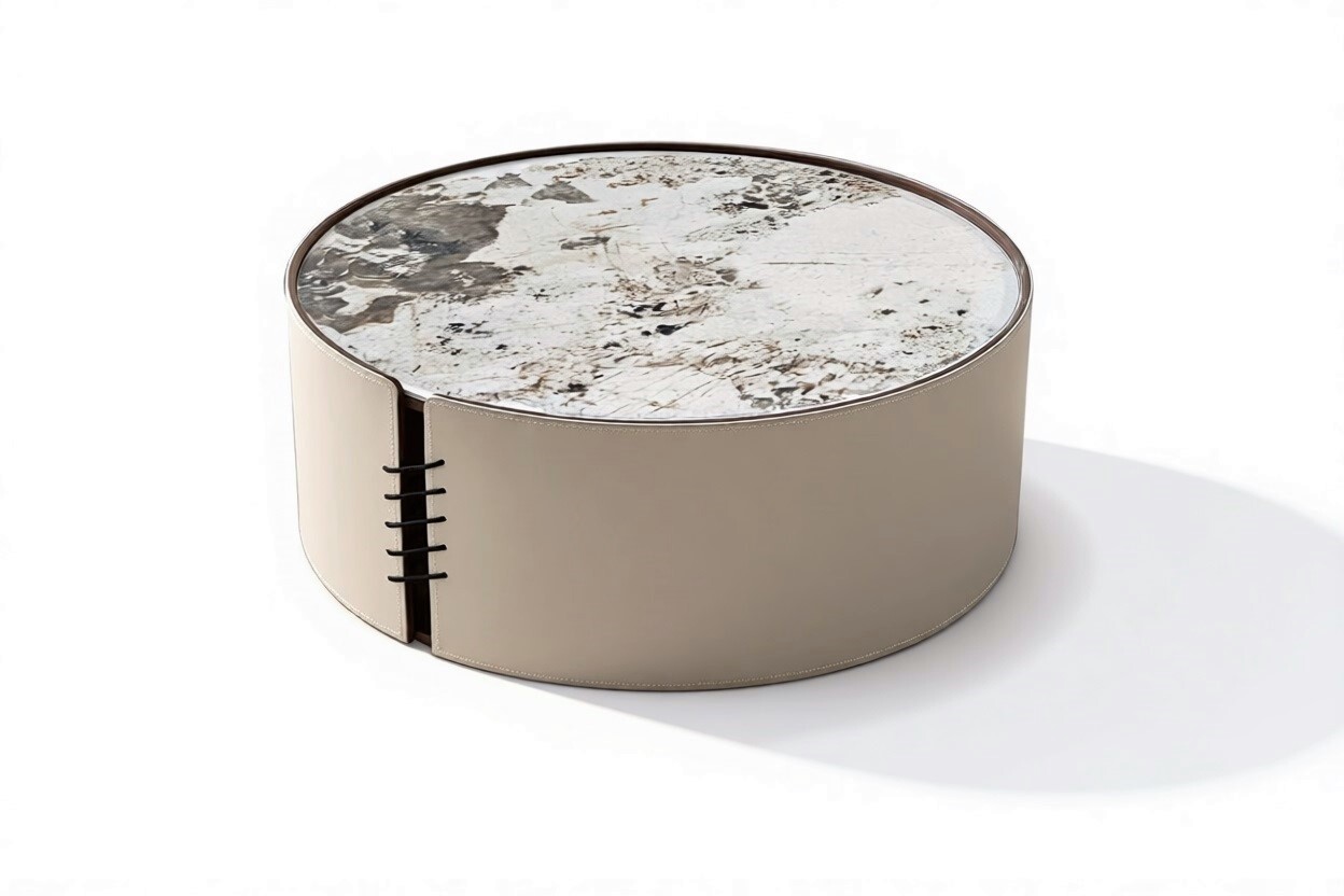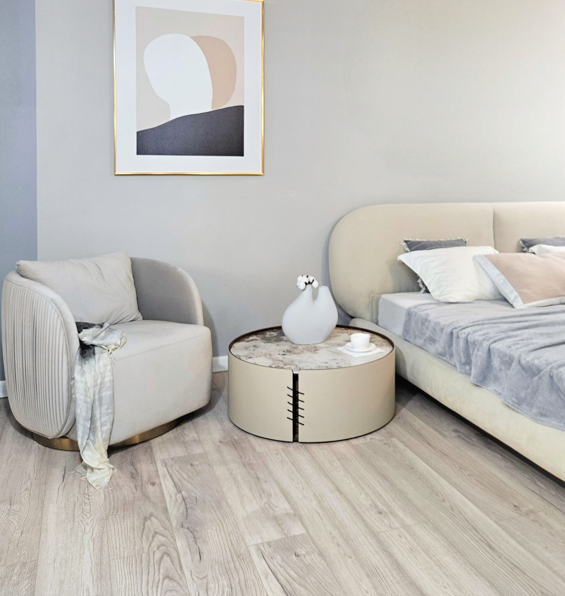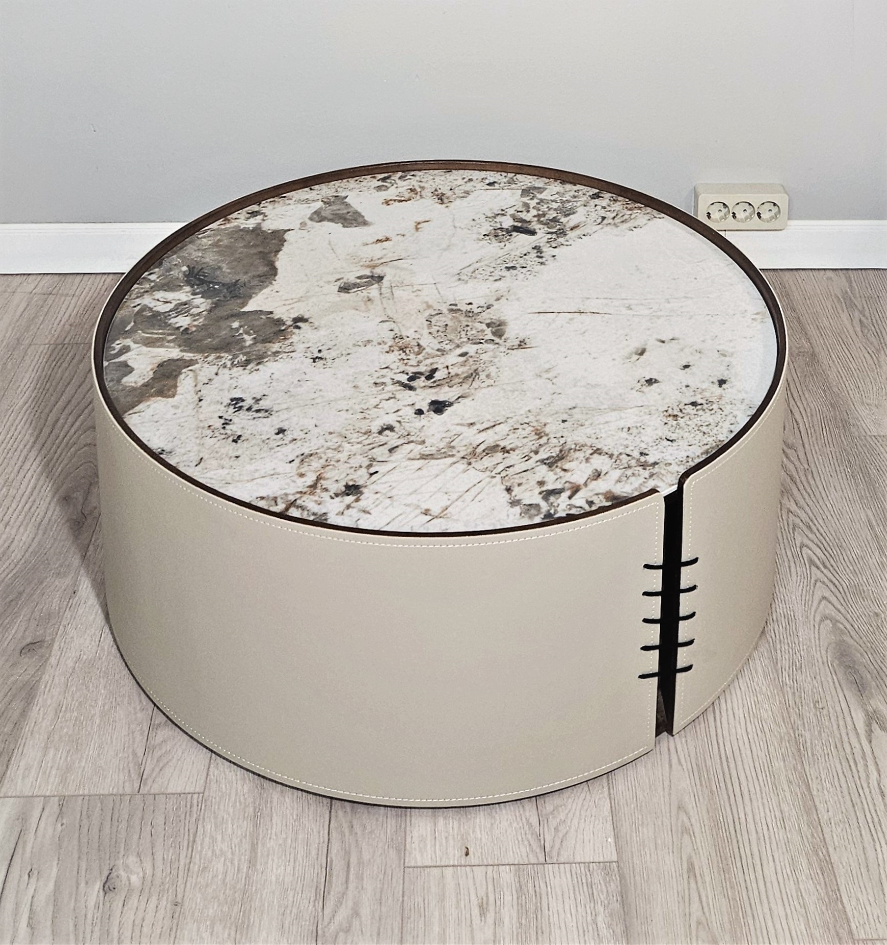 Обивка выполнена из экокожи в серо-бежевой цветовой гамме.