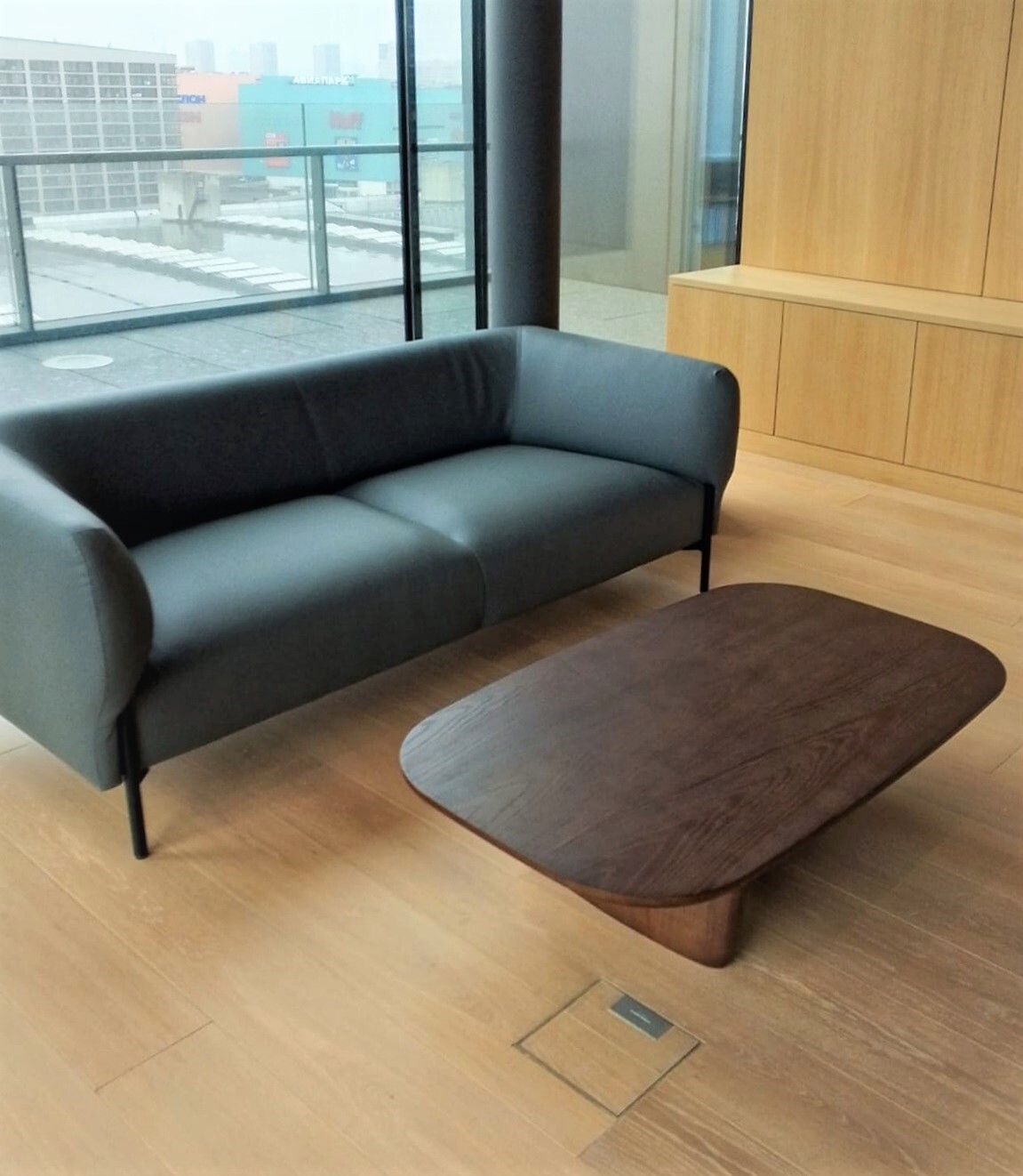 Матовая, приятная на ощупь структура стола на элегантных округлых опорах.