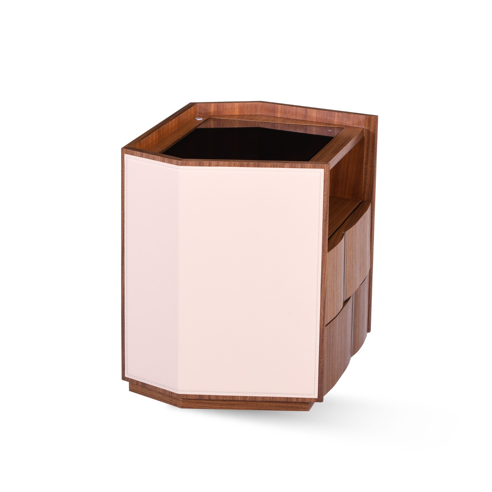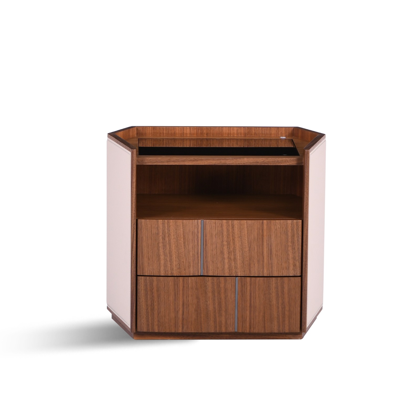 Два выдвижных ящика из орехового дерева и открытая полка обеспечивают организованное пространство для предметов первой необходимости, а геометрический, слегка угловатый силуэт придает классической роскоши современный оттенок.
