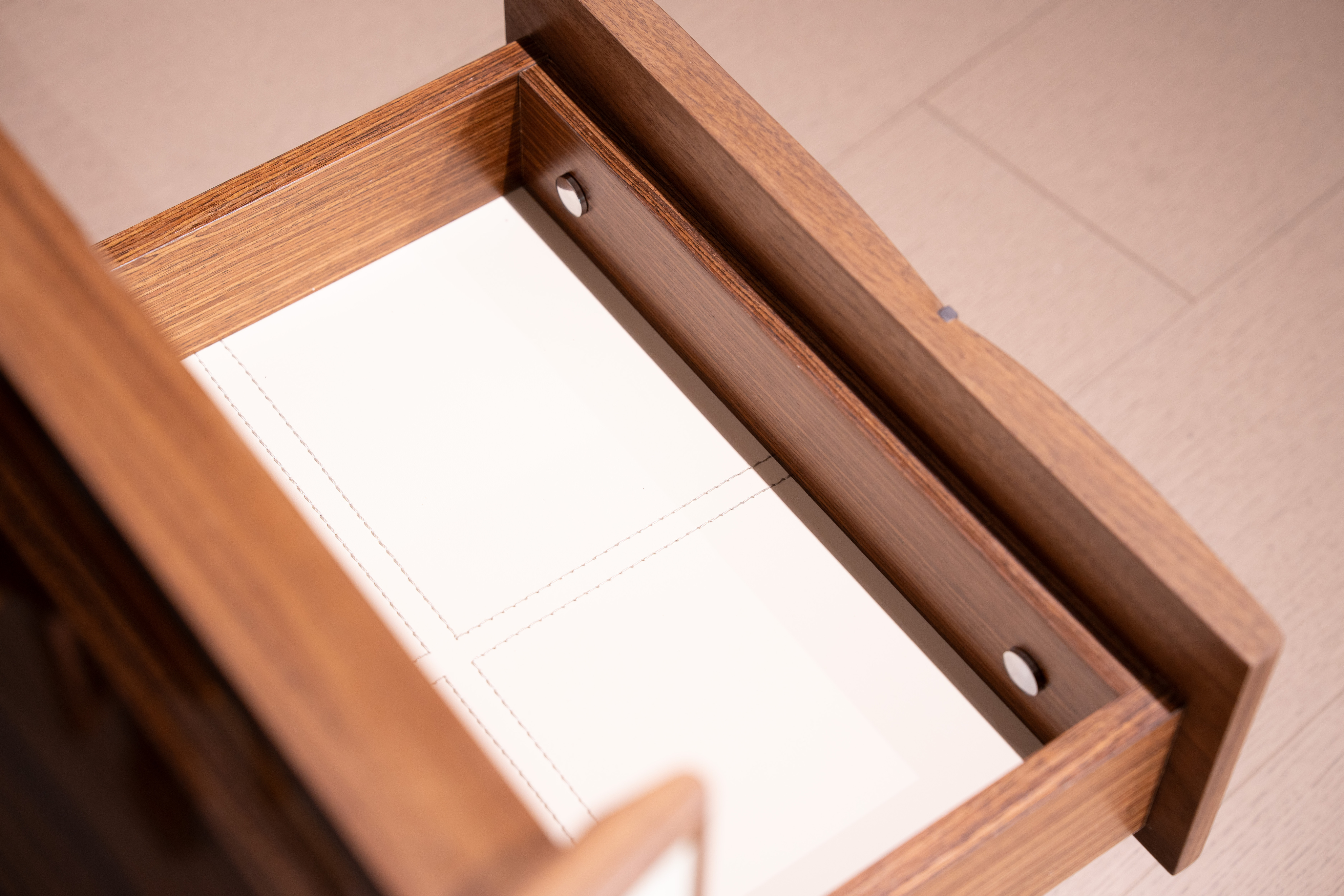Изготовленная из высококачественного орехового дерева с богатым натуральным рисунком, она излучает тепло и изысканность. Боковая панель элегантно отделана мягкой светлой кожей с тщательной прострочкой, которая подчеркивает внимание бренда к деталям.