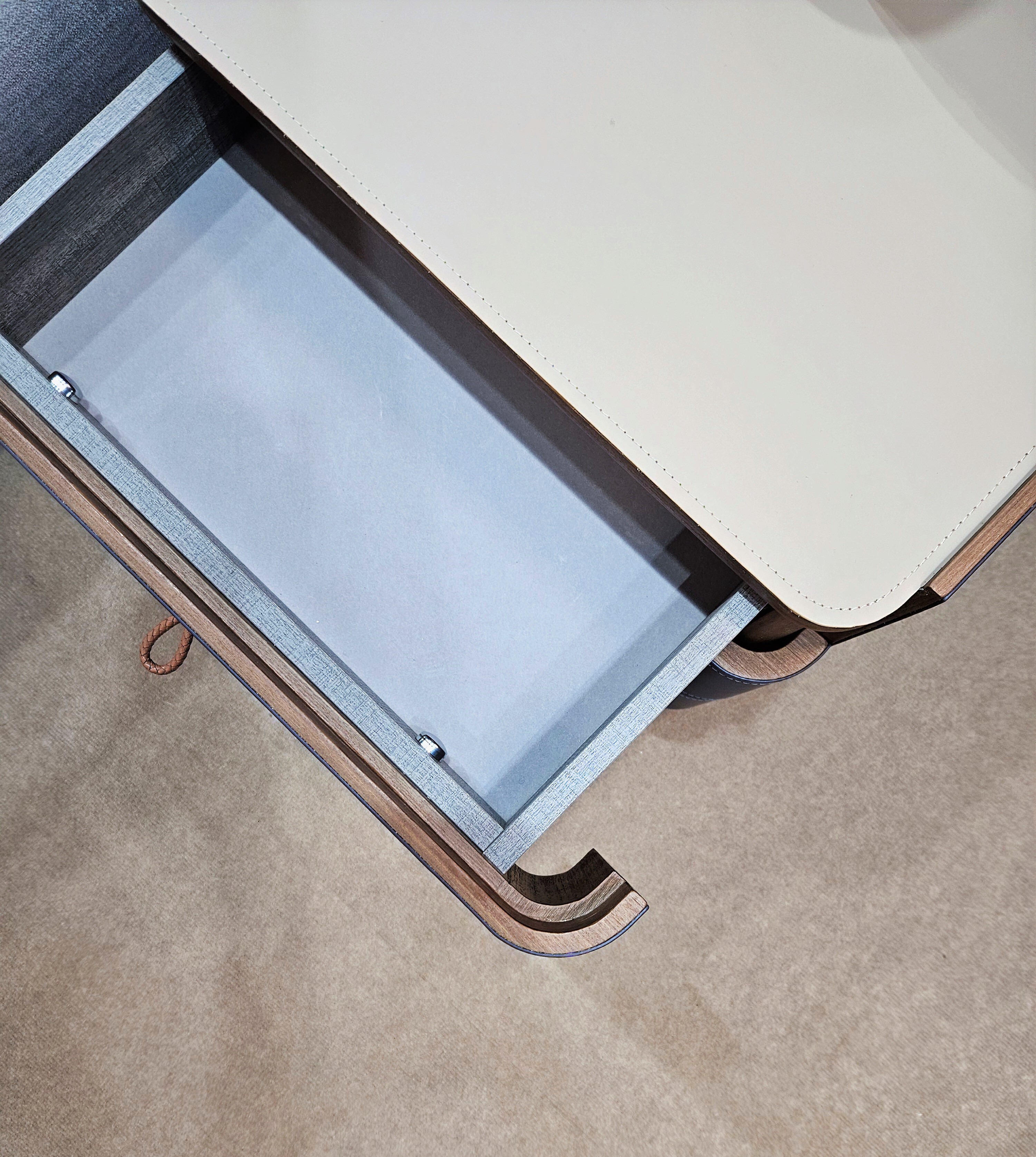 Ящики и края столешницы украшены натуральным шпоном цвета орех.