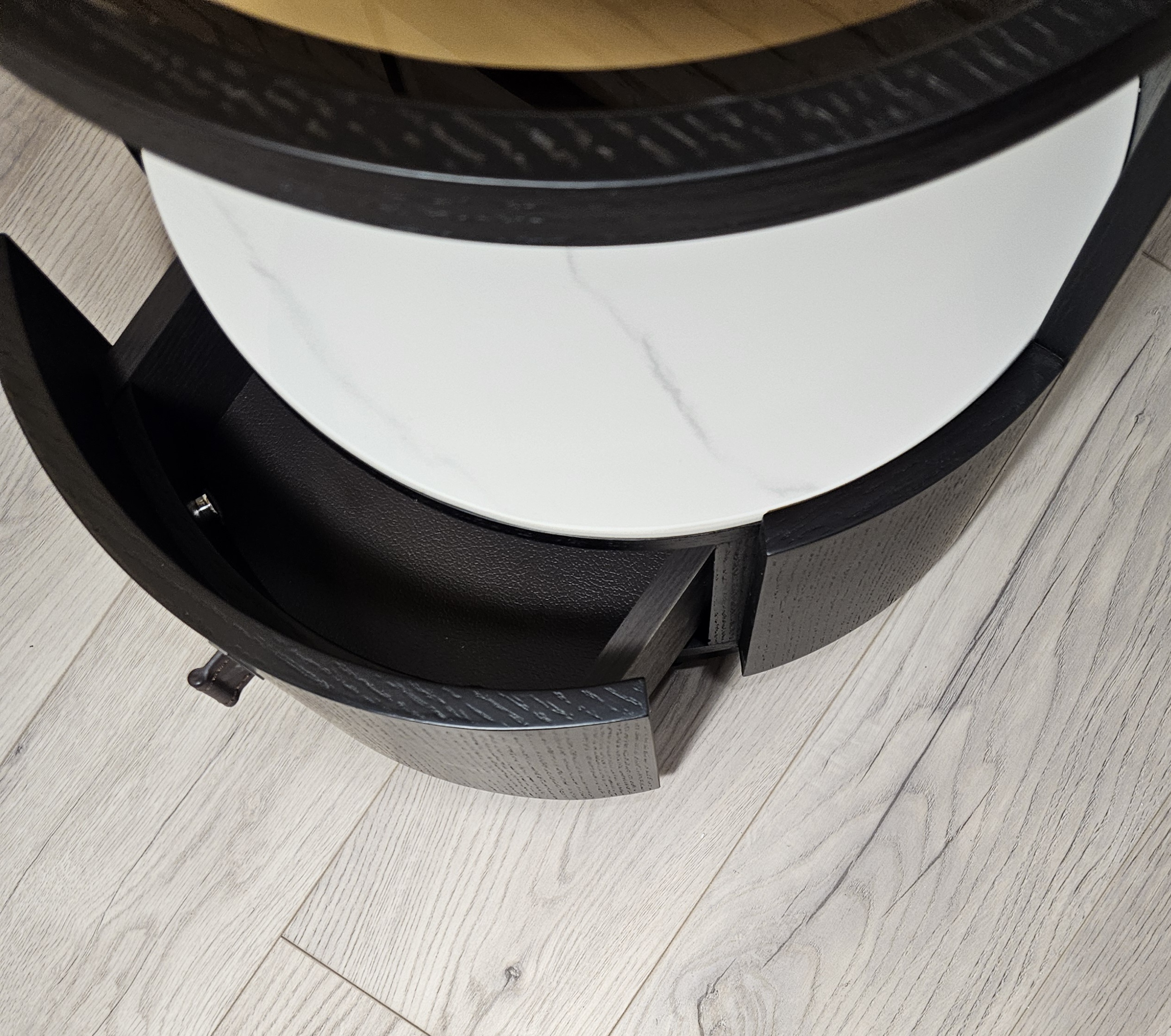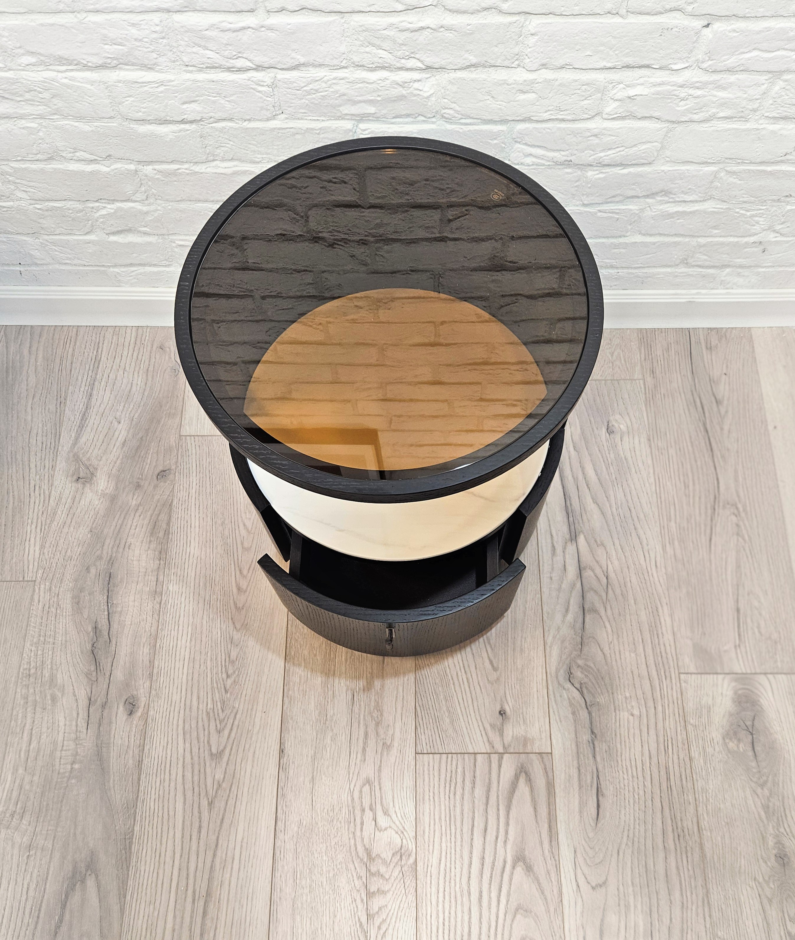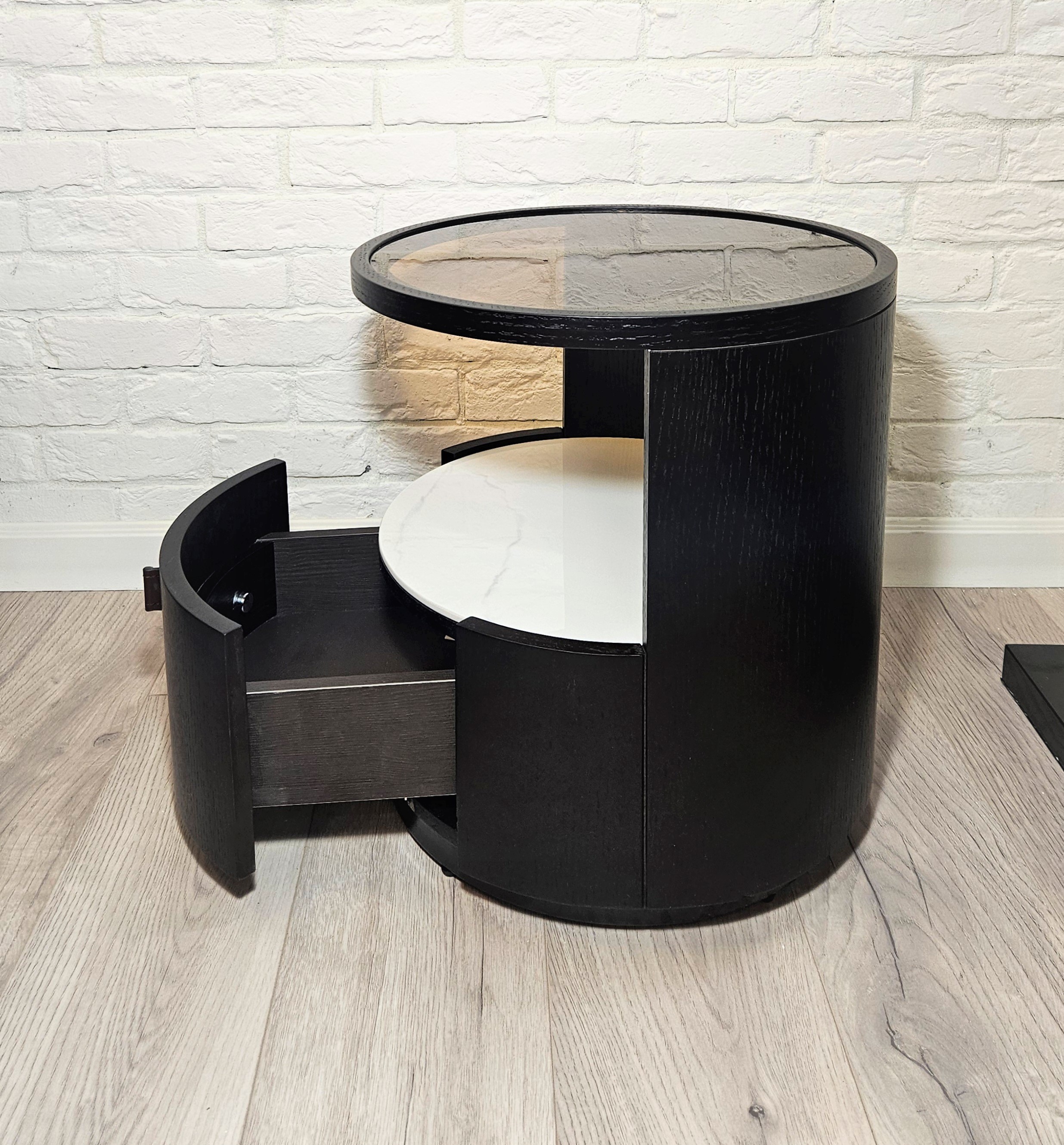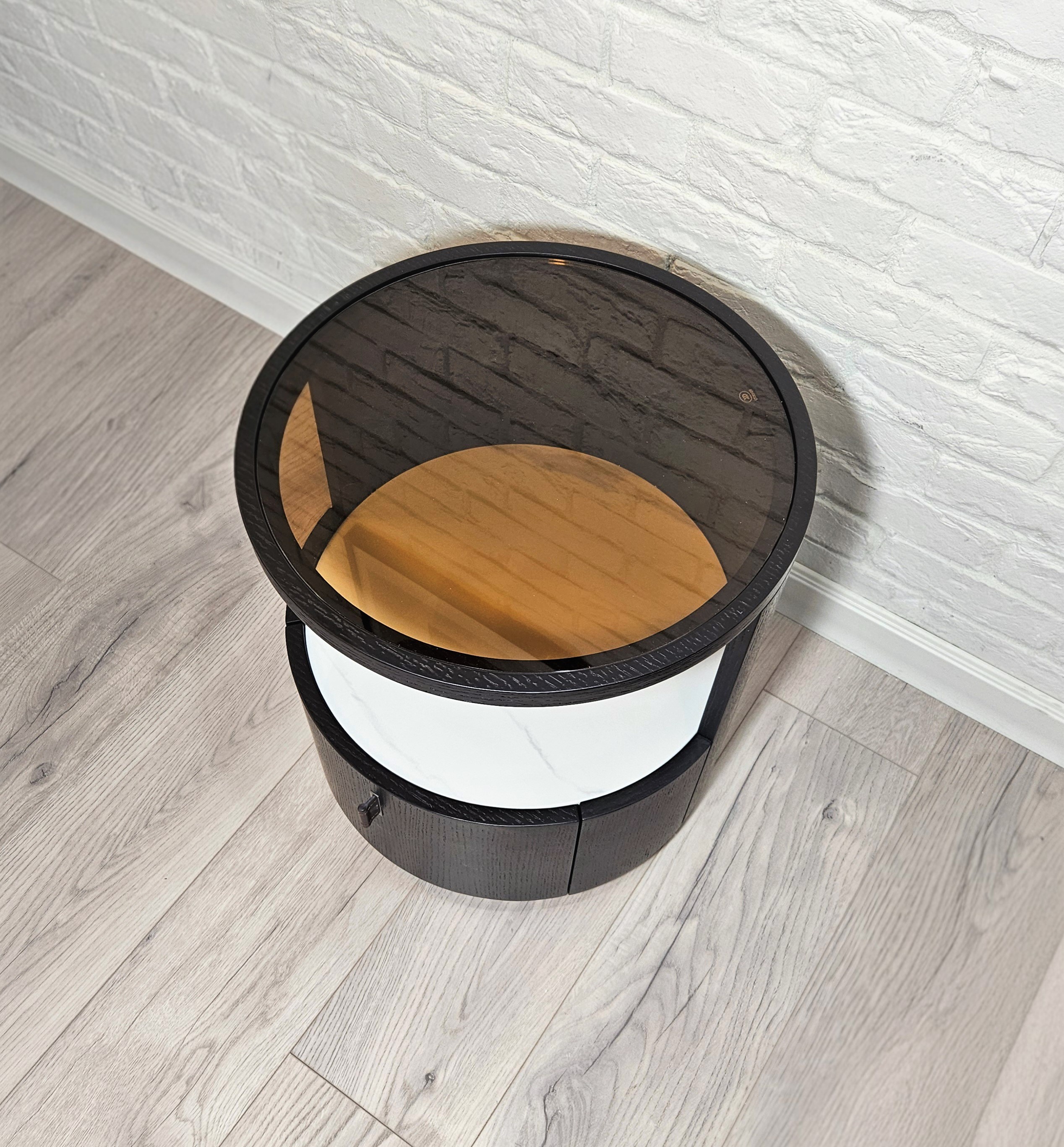 Тумба представляет собой комбинацию открытого отделения в сочетании с выдвижным ящиком.