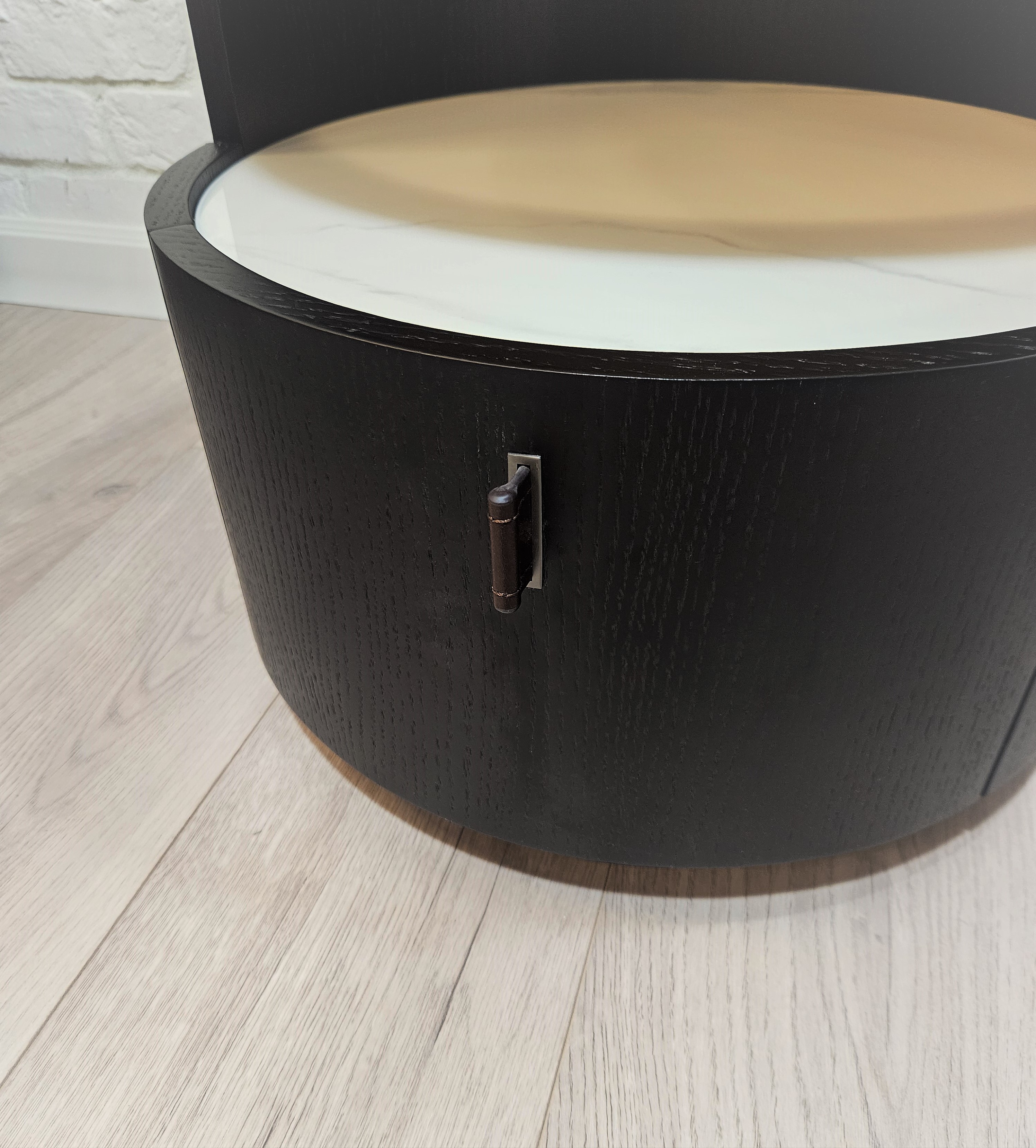 Отделка тумбы выполнена из натурального шпона, цвет черно-коричневый.