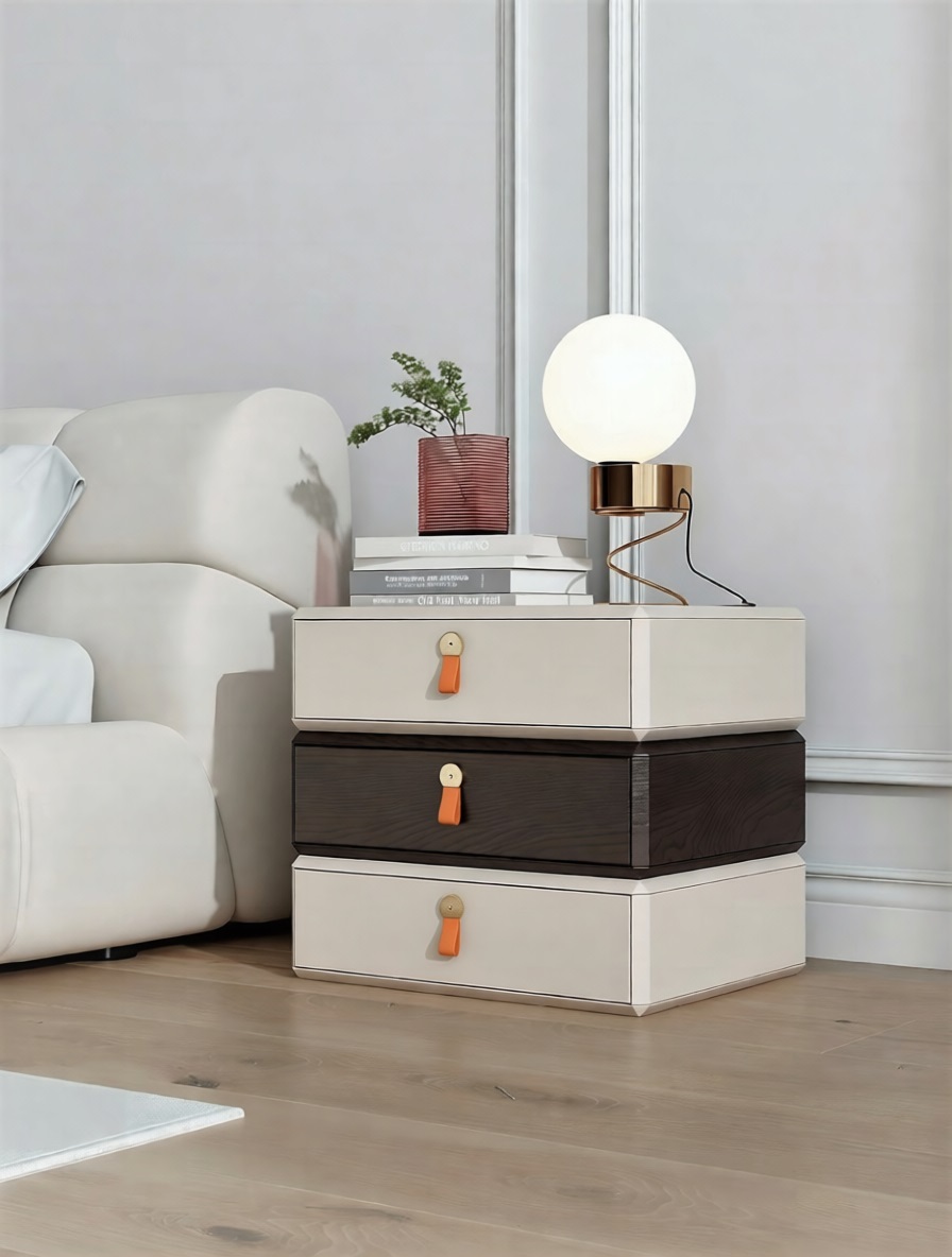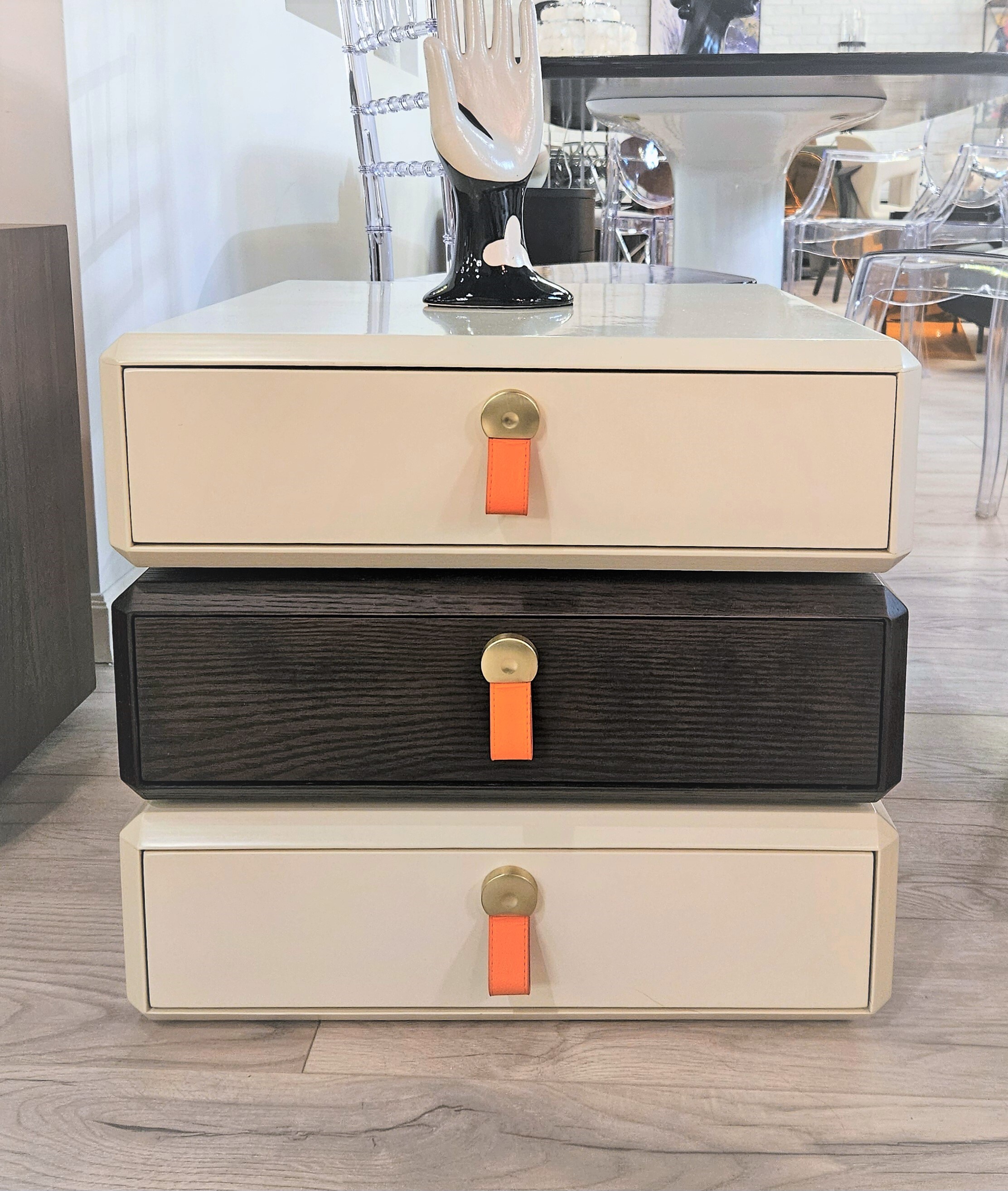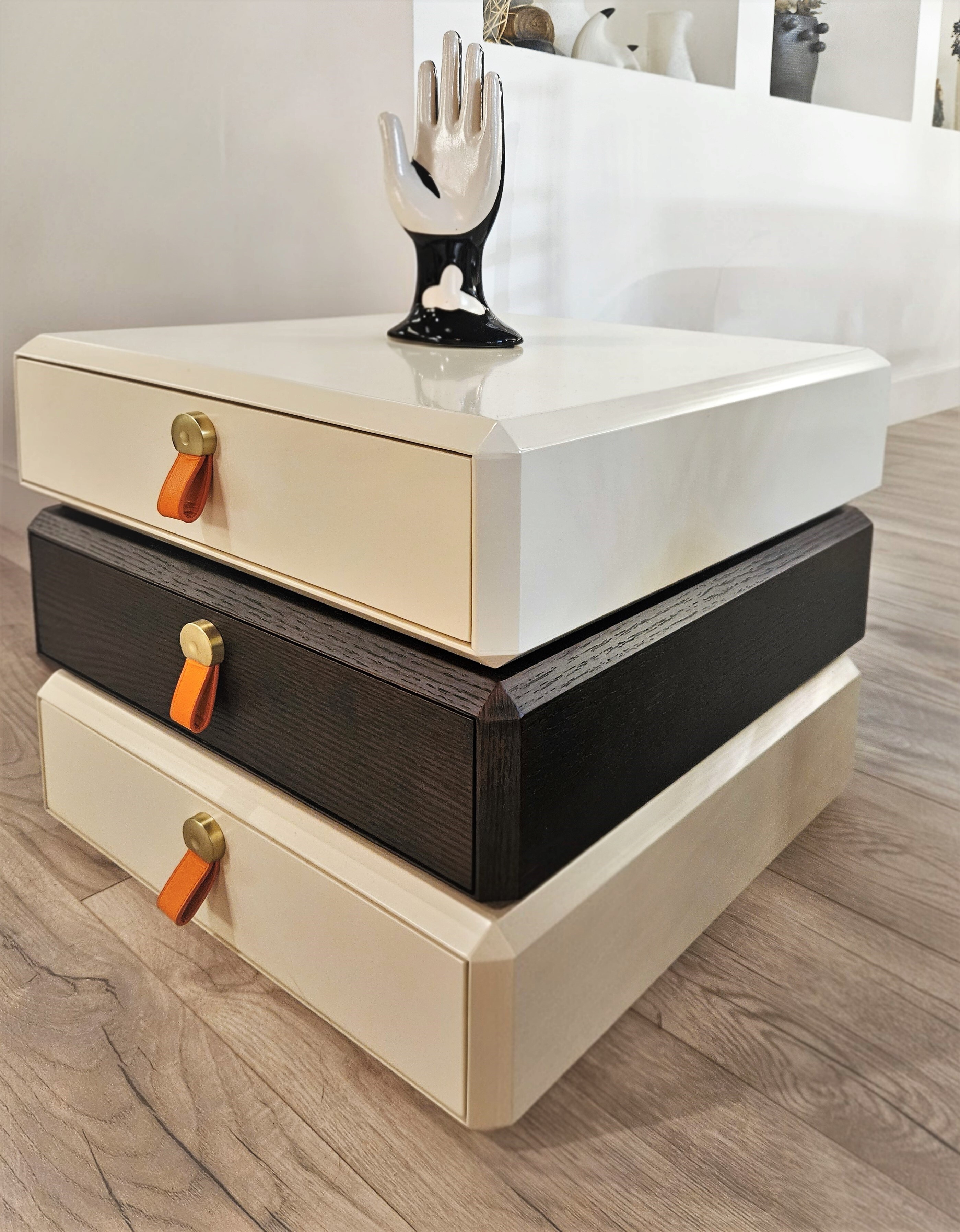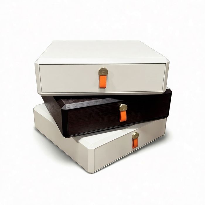 Два верхних выдвижных ящика могут быть смещены относительно нижнего ящика тумбы.