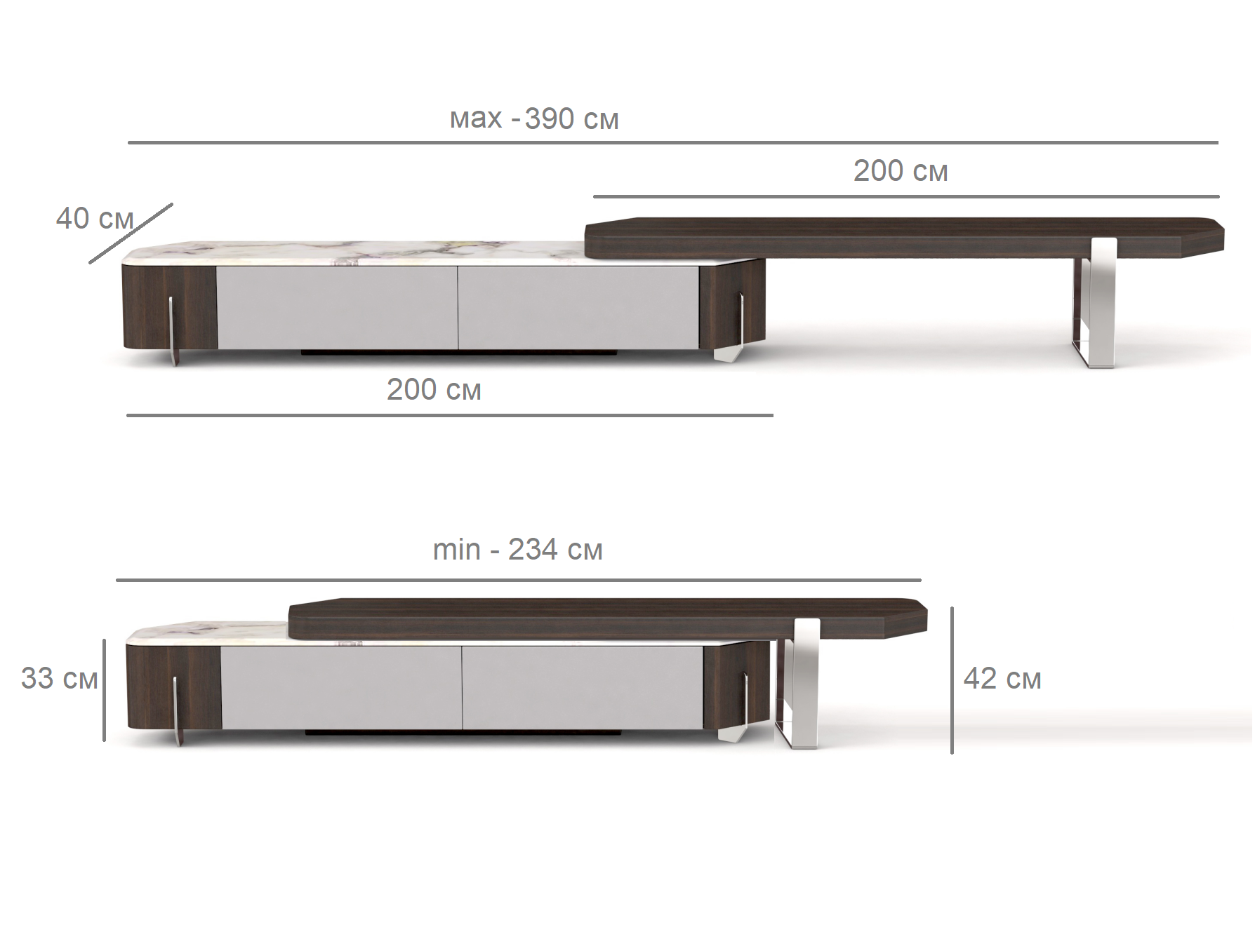 Вторая часть — столешница из натурального шпона, которая может сдвигаться влево или вправо над основной частью тумбы.